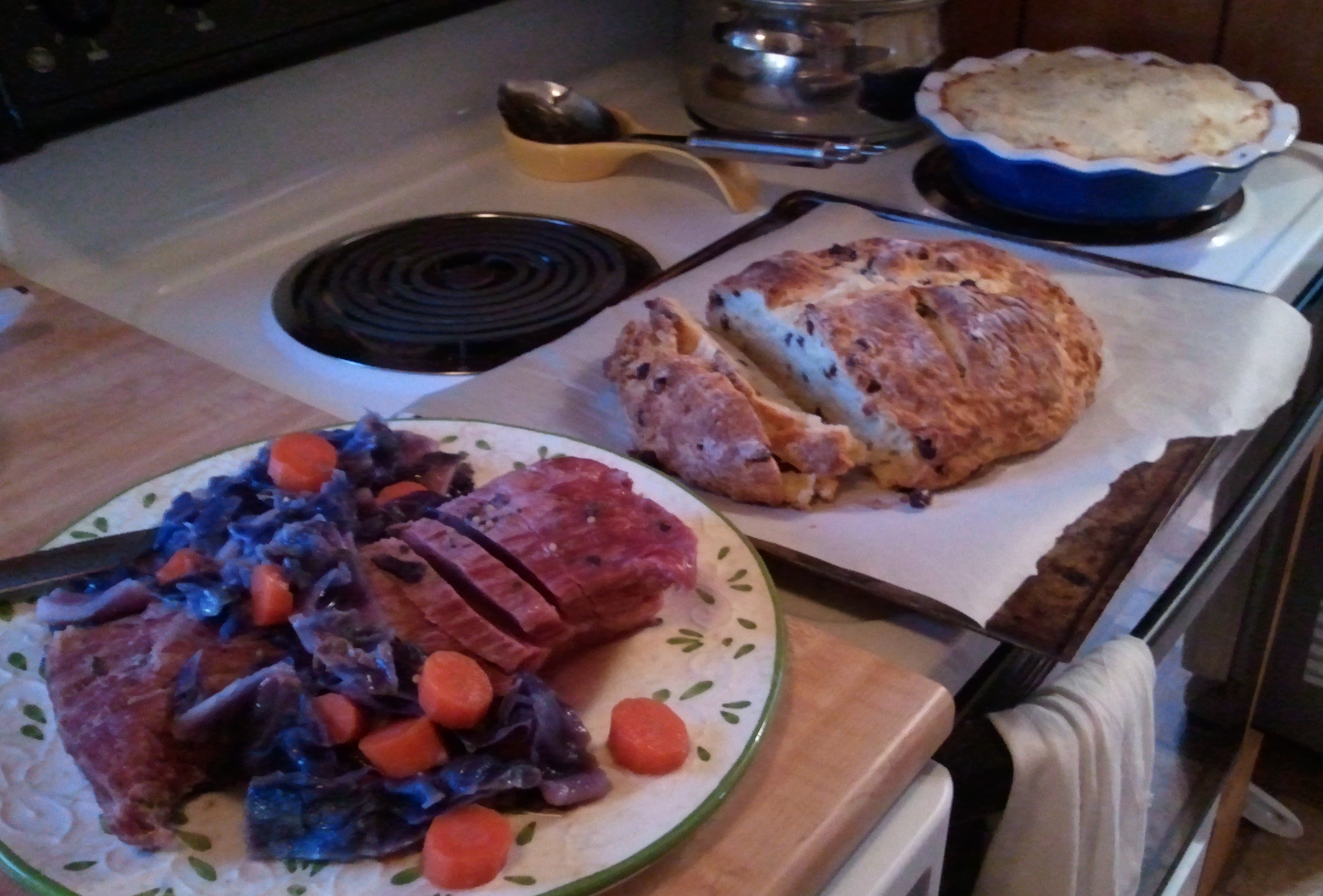 No, really, I am. Papa’s grandpap was Irish, so I don’t know what that makes me. (I’m just a baby—I can’t do that kind of math.) So Mama decided to treat us to some Irish fare for dinner. She had all the burners going, plus the oven, so there was a lot to take in.