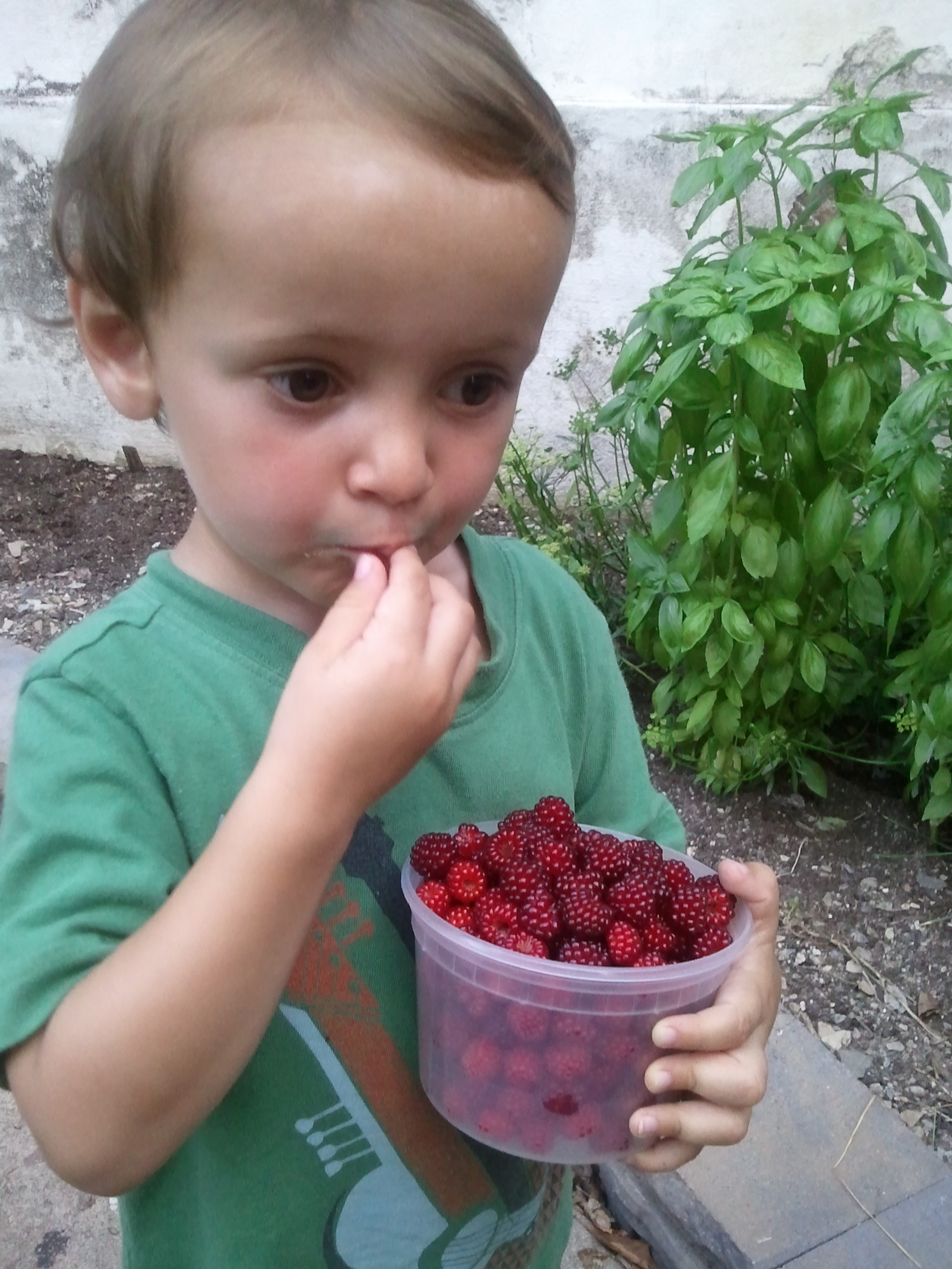 Until then, Mama goes on a raspberry raid almost every day, though she sadly reports that they’re coming to an end. I get to eat them with my yogurt in the morning or as a snack throughout the day. They’re yummy and very sweet. I like that they’re so tiny, and Mama likes that they keep in the fridge for a couple days without spoiling. When she started picking more than we could eat, though, she decided to make a small batch of freezer jam. Because it gets very hot and can splatter, she didn’t let me near the stove when she made it. But I did get to taste the result when she spread it on a homemade flatbread that Papa grilled, then topped with arugula and dollops of ricotta. Wherever the fruit comes from, I could get used to this kind of eating.