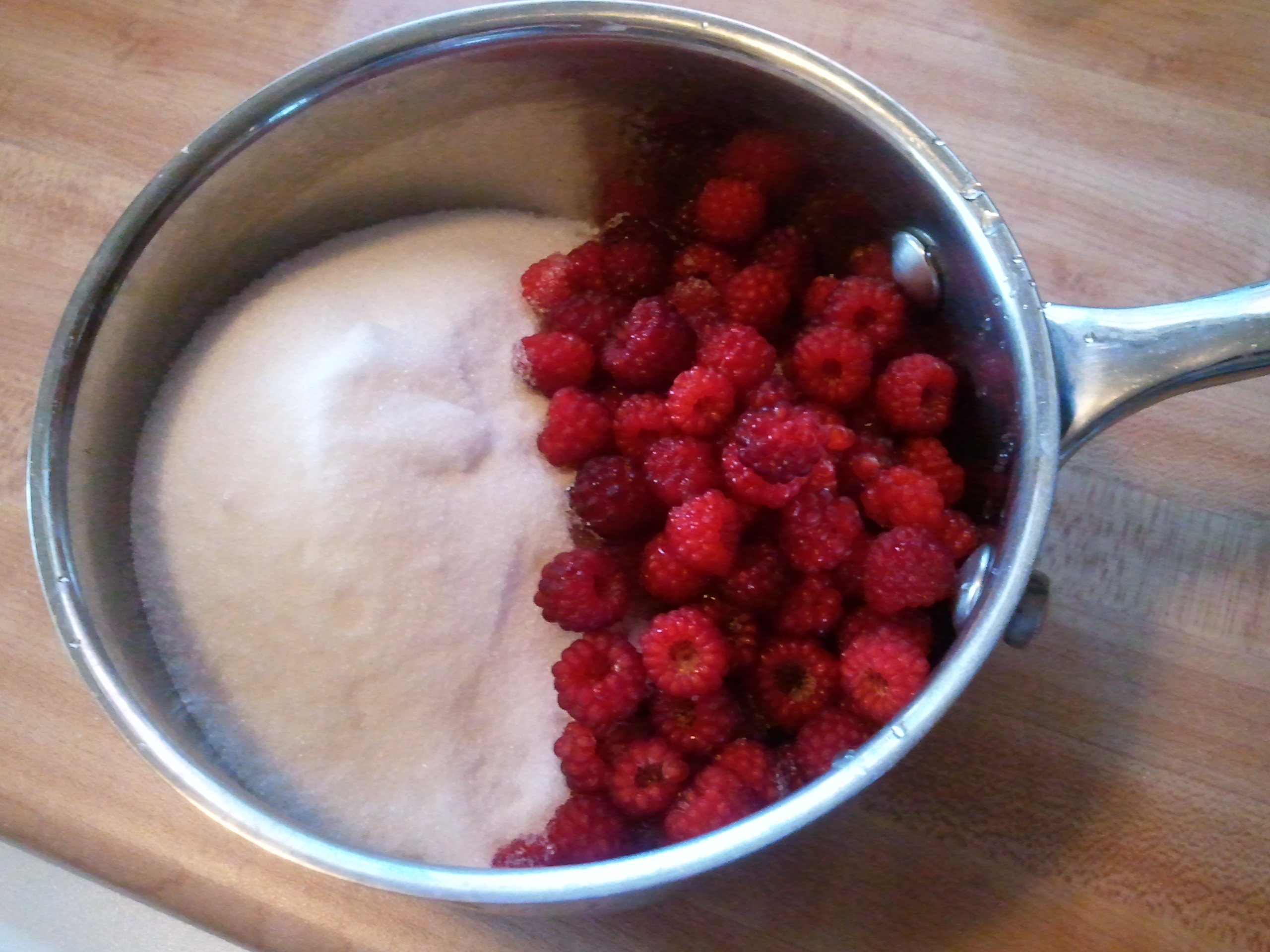 Wash and prep your berries (hull and halve strawberries, destem blueberries, etc.). Add them to a small saucepan with the sugar and lemon juice.