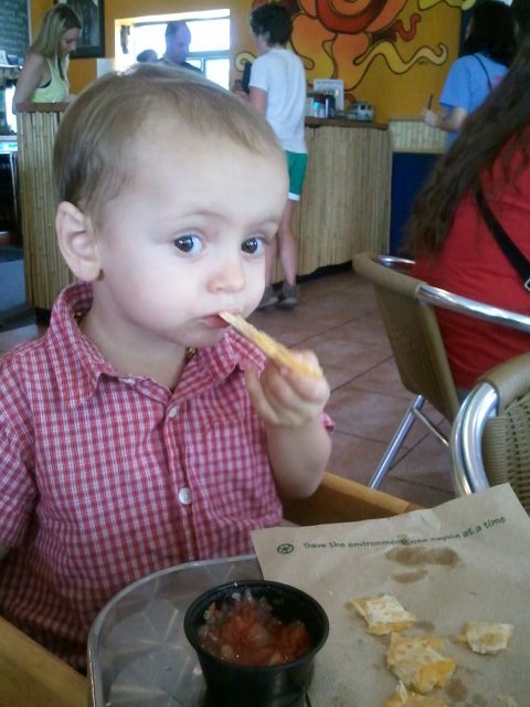We were actually at the hospital quite a while, so we missed lunch. Mama took me to one of her favorite places to eat: a burrito joint where she says she ate at least once a week when I was growing inside her. There are two things she loves best about the place: its smoked tofu and its fish tacos. This was my third time going where Mama actually ordered something for me, instead of giving me bites of her food. You know I can be a picky eater, but I have to tell you, I love the food here. I can eat almost an entire beef taco or cheese quesadilla by myself. And I like dipping their homemade tortilla chips in the different salsas. (Yesterday they had pineapple-mango.) Neither of us know what it is about the place, why we like it so much. Its food is superfresh and locally sourced when possible; it’s reasonably priced and fast. The music they play is pretty cool, too.