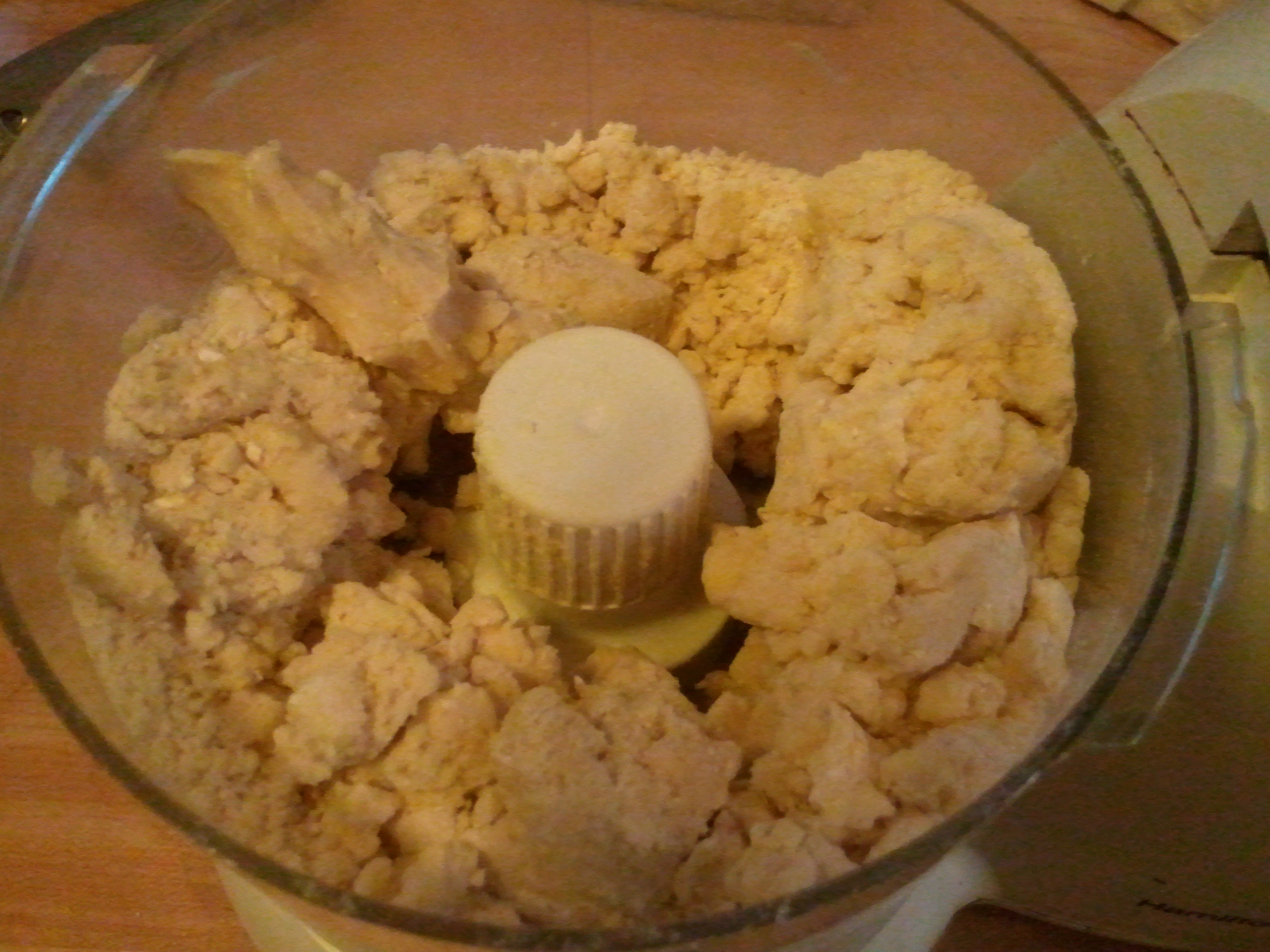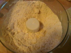 Meanwhile, Mama made the crust. She explained to me that she doesn’t generally like making crust in the food processor because then she has to clean the darn thing, but since she would be making pesto with it anyway, she figured why not? To the processor, she added her flour, oats, and salt. Then she added her butter and processed it just until little clumps formed.