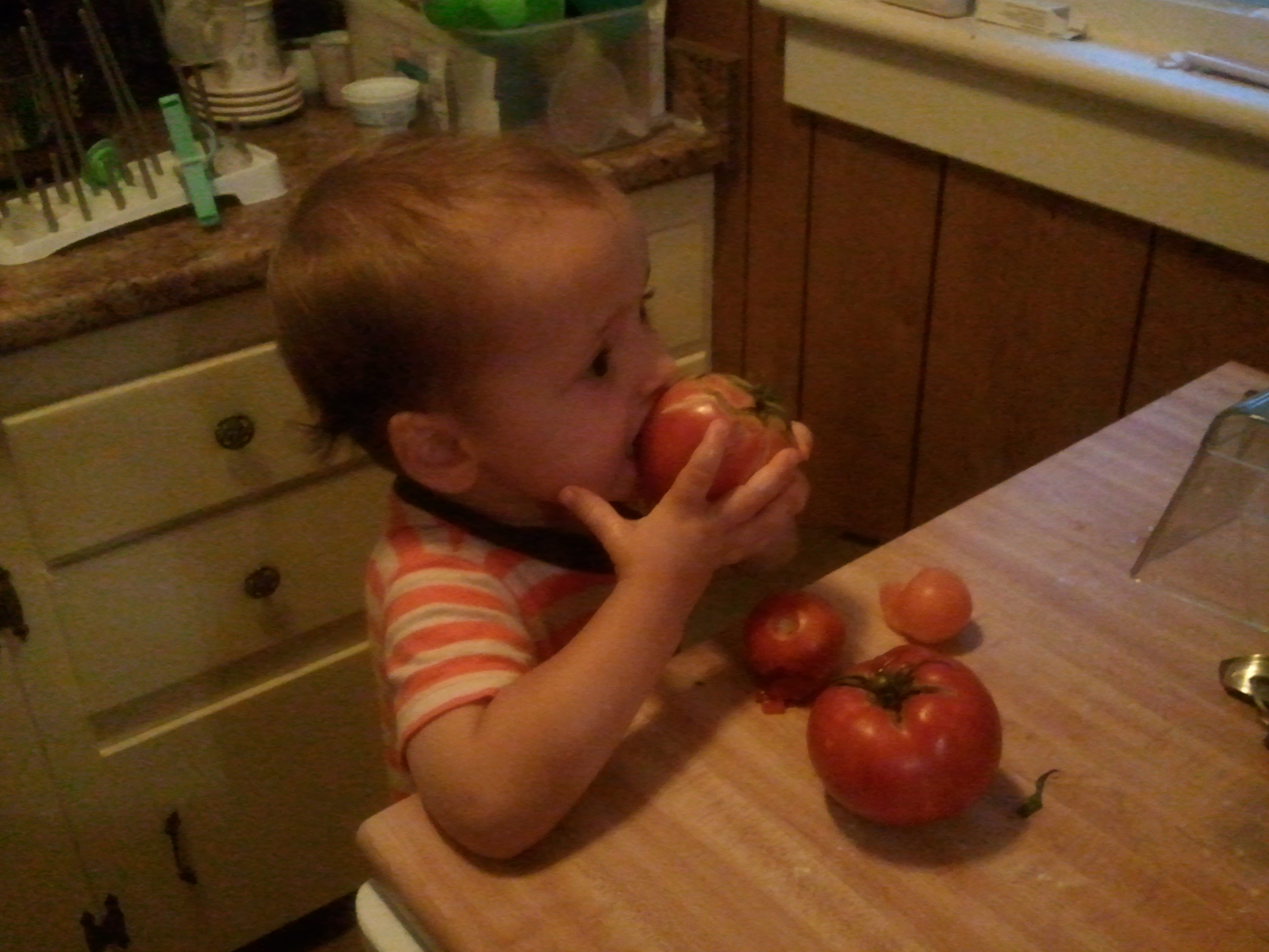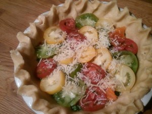 A tart is so pretty and sophisticated (like myself), but Mama had so many tomatoes that she decided to turn this into a deep-dish pie. I sampled many of the tomatoes to be sure of their ripeness, which is rather strange considering that I rarely eat raw tomatoes.