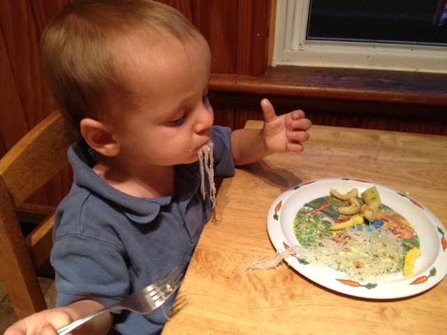 Mama had the back of her mind on alternate dinners for me, so sure she was that I wouldn’t eat the pad thai. But since she opted to go without the chilies, there was nothing about this I didn’t like. Those springy noodles were great, and I really liked the egg! The crunch of peanut was nice, too. But you know… I felt it needed more lime. So I said so. “I need lime.” And the reward for my fledgling sentence was more lime. Mama also served a cucumber-soy-ginger salad on the side. I had one salty bite, but I preferred the pad thai. What can I say? I’m a simple guy.