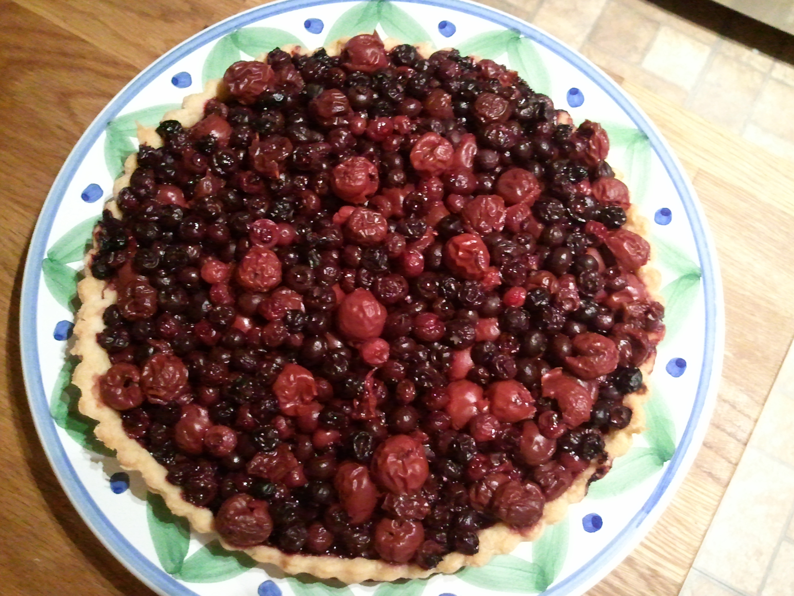 So while I slept, Mama felt like making a tart. She happened to have leftover dough in the freezer from the tomato pie, so she just used that. And she swapped a cup of the blueberries for a cup of pitted sour cherries, and omitted the lemon juice in favor of the cherry juice.