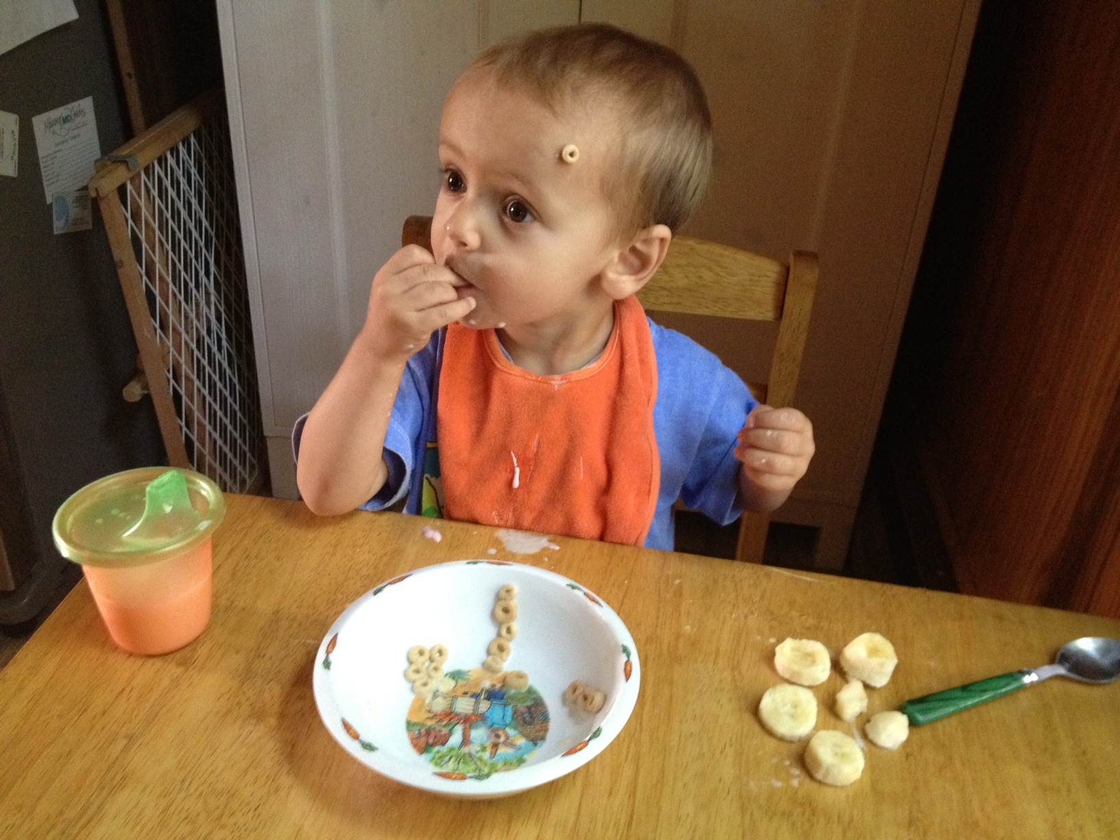 When we got home, Mama spent a lot of time washing the berries and fending me off from eating them by the handfuls. They had a lot of grass clippings—and bugs!—on them. I helped her de-stem them, too. (That’s a very good task to give someone my age…until said someone starts snacking on them, stems and all.) Because most of our haul was intended for the freezer, Mama spread the berries on a towel-lined cookie sheet so they could dry. (This is why you can buy frozen berries that are separate and perfect, rather than in clumps—they’re individually quick frozen.) You spread them out on a sheet, make sure they’re relatively dry, then pop the sheet in the freezer. Once frozen, you can put them in storage bags or containers. We got 3 sheets of bluebies.