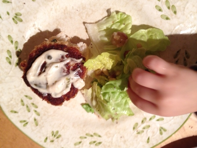 As I learned when I picked up one of these golden patties and put it in my mouth. It was a crab cake! Mama kept it simple and followed the recipe on the side of the can, but she said you have to pick through the crab just to be sure there are no bits of shell. She fried them in oil, and while they were frying, she made tartar sauce: mayo, capers, relish, Worcestershire sauce, salt & pepper (all to taste). “Oooh, capers!” I said, as I dipped my crab cake in it. It probably wasn’t my favorite thing to eat, but I ate almost the whole thing…until my tartar sauce ran out.