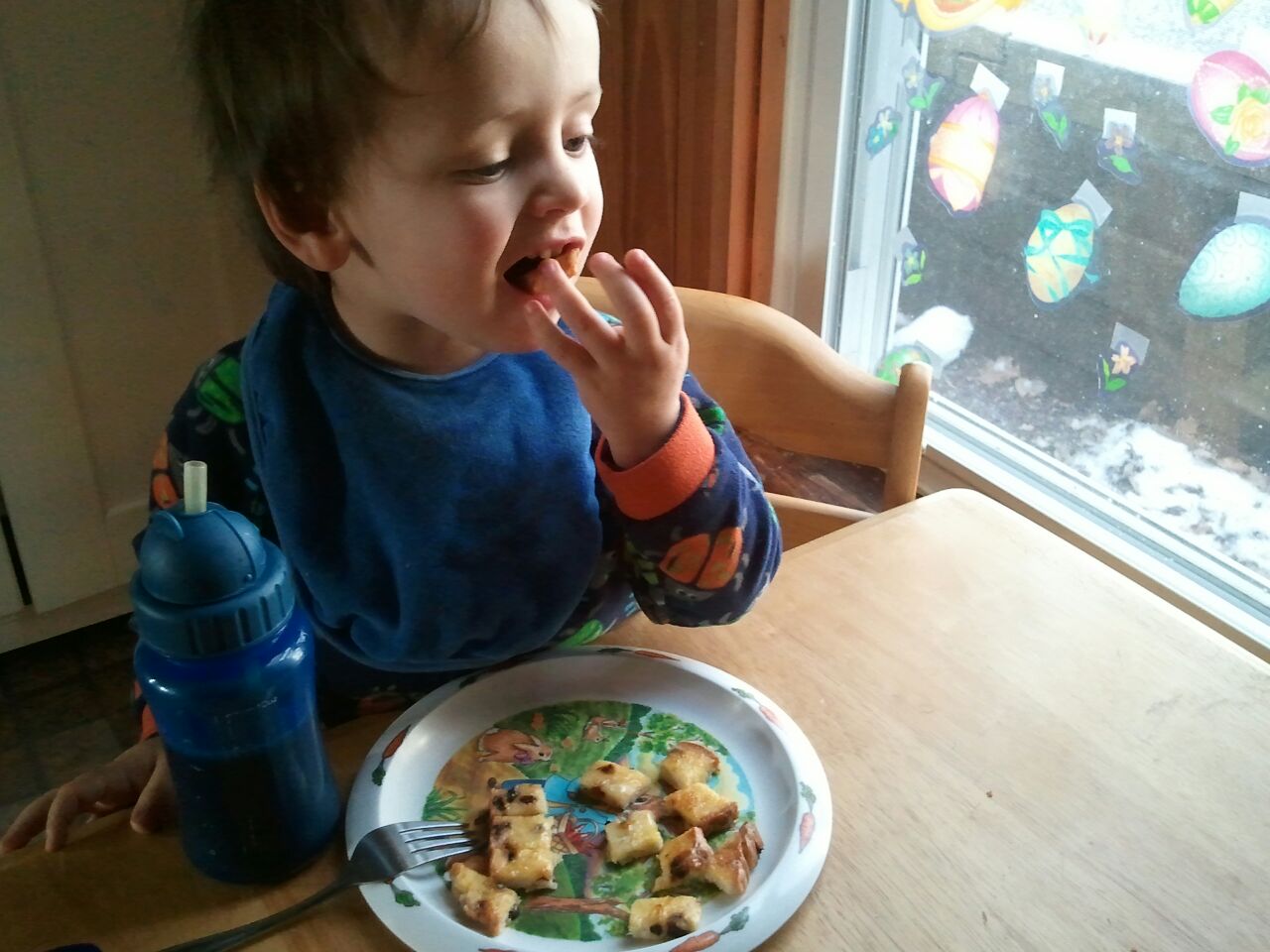 How can anyone keep all these holidays straight? Between my daycare’s crafts and Mama’s half-hearted window decorations, I didn’t know if a leprechaun was coming to hide eggs or a giant bunny was snoozing under a rainbow with a bunch of money. It’s all very confusing to a 2-year-old, having Easter follow so closely on the heels of St. Patrick’s day. I’ll just tell you a little bit of what I ate on both days.
