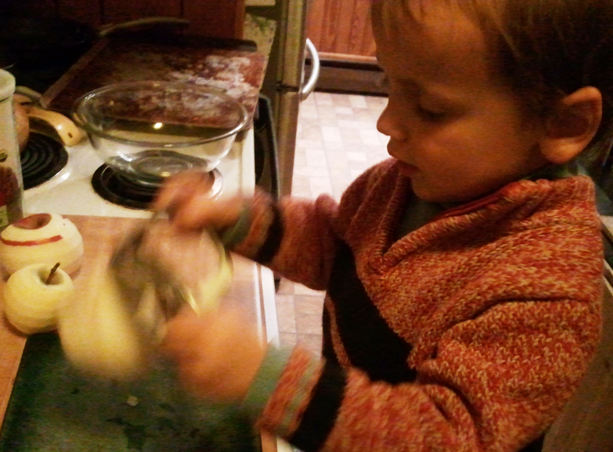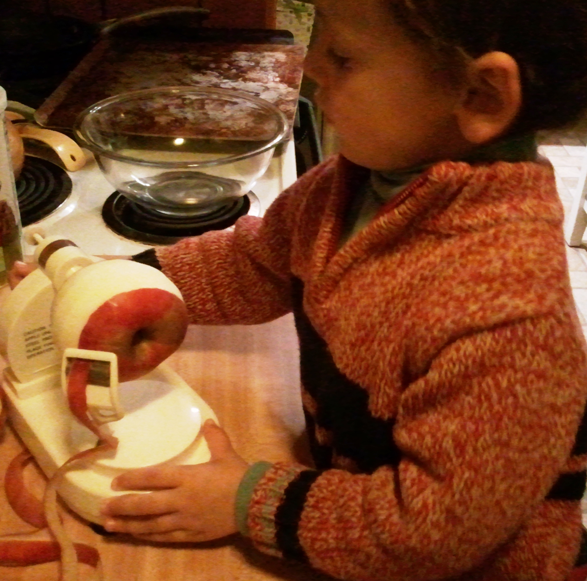 Prepare the apples. I like to use this nifty crank to peel the apples, and then Mama sometimes uses a fancy apple corer to break the apple apart.