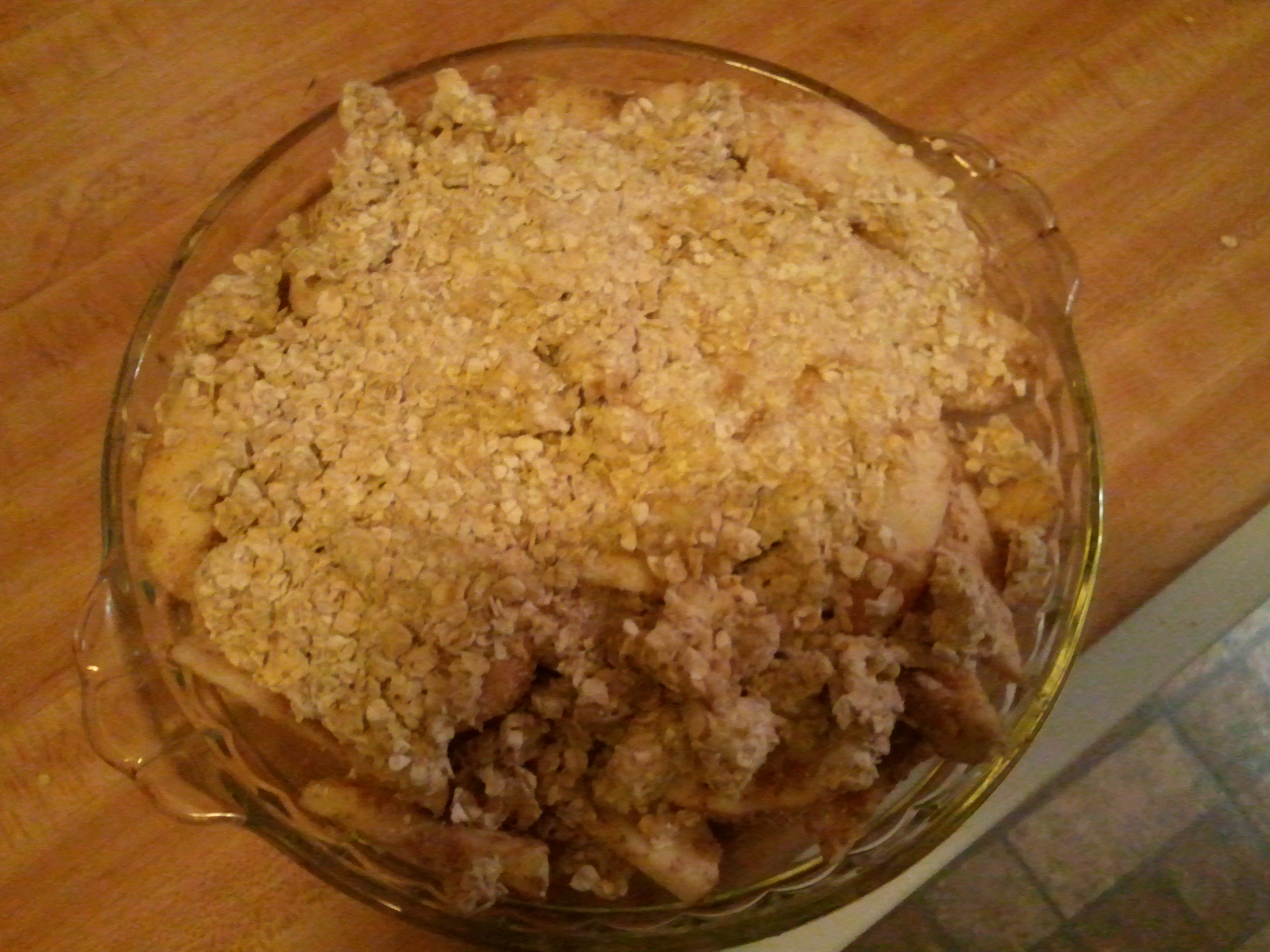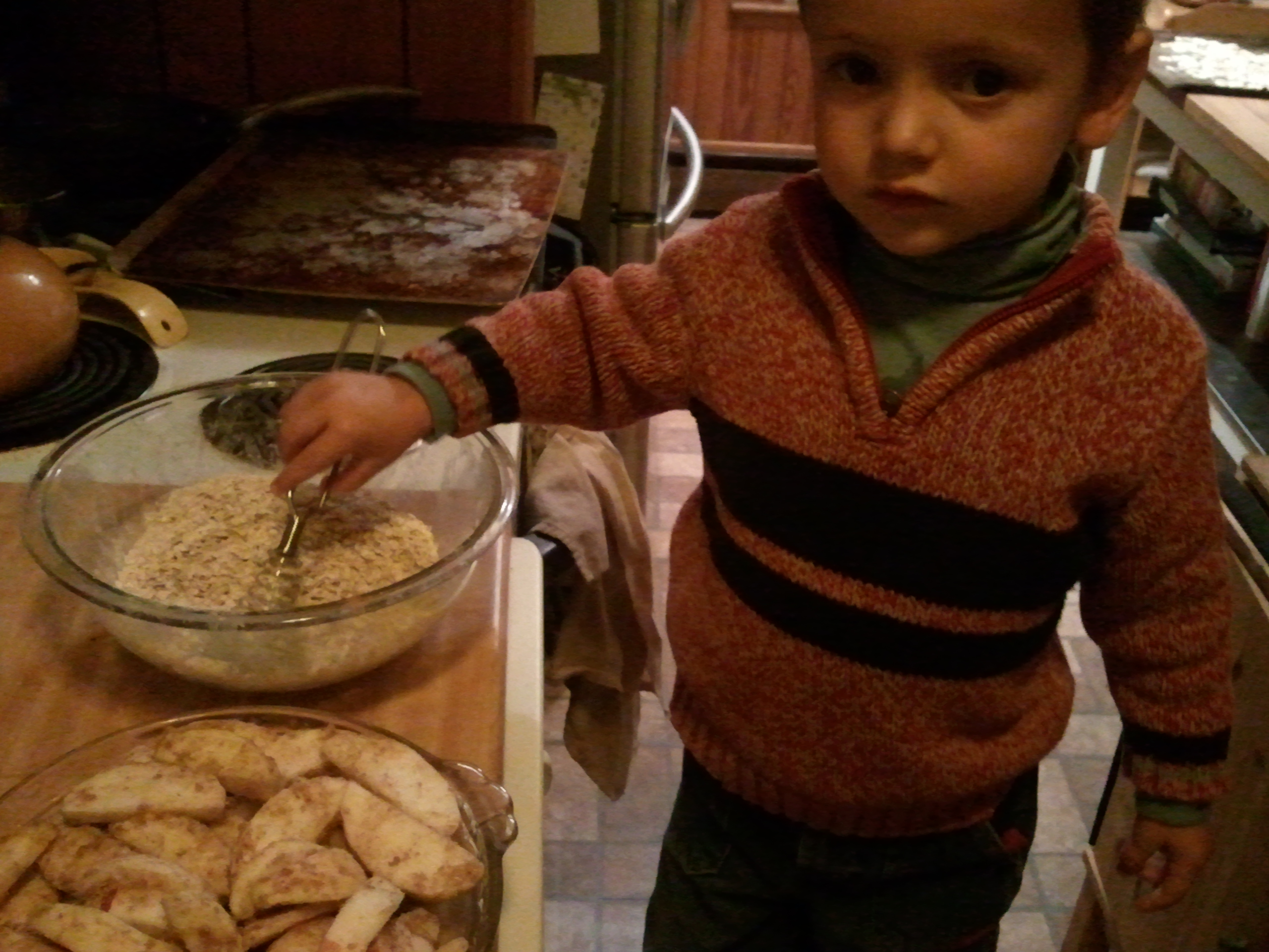 Mix with your hands or a large spoon. I had to wash my hands after doing this! Pour it all into a pie plate. Spread the apples so they lie relatively evenly. To the bowl, add more flour and brown sugar, a couple handfuls of oats, and more spices (if desired). Mama didn’t add any more cinnamon to our crumble topping. Stir it all up. (I happen to like using the whisk.