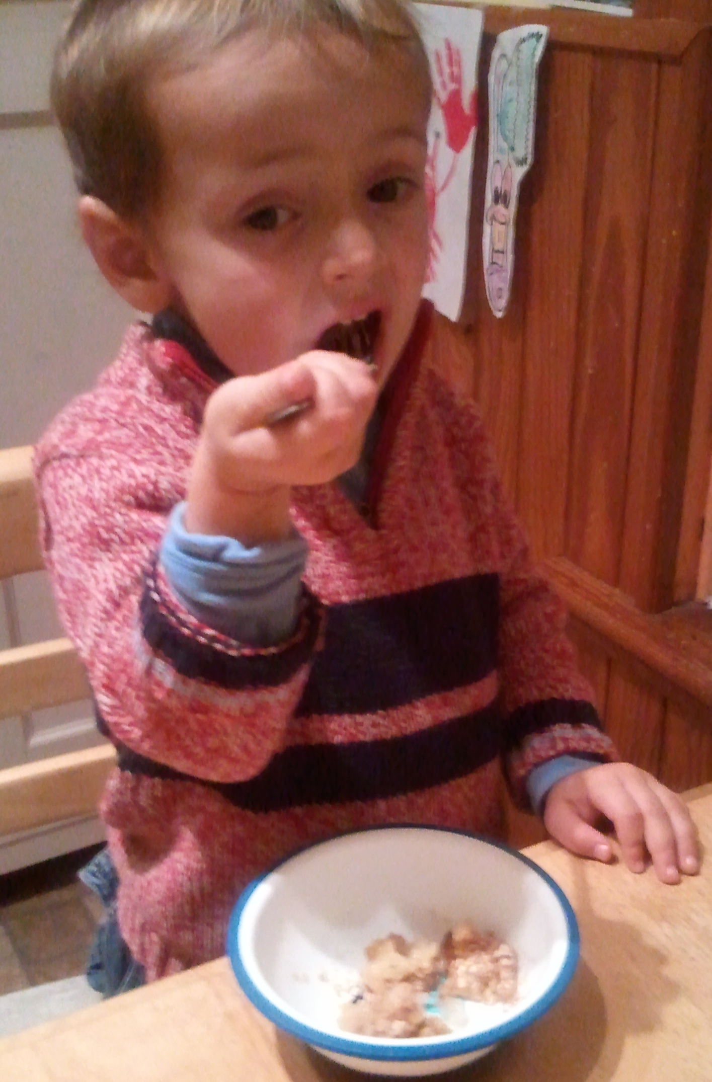 Bake until golden and the apples are soft, about 45 minutes. Allow to cool slightly before digging in. Serve with ice cream or whipped cream. And, whatever you do, don’t hold it hostage until your kid finishes his dinner. That’s just mean.