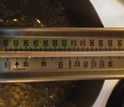 The red line of the thermometer is really close to “soft ball.” It takes a while to get there, but once it’s close, you have to be ready for it!