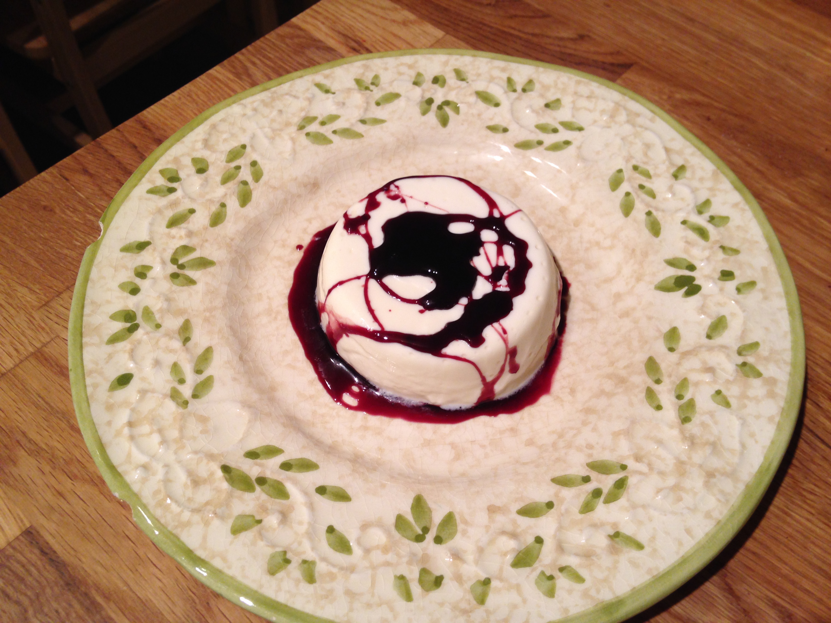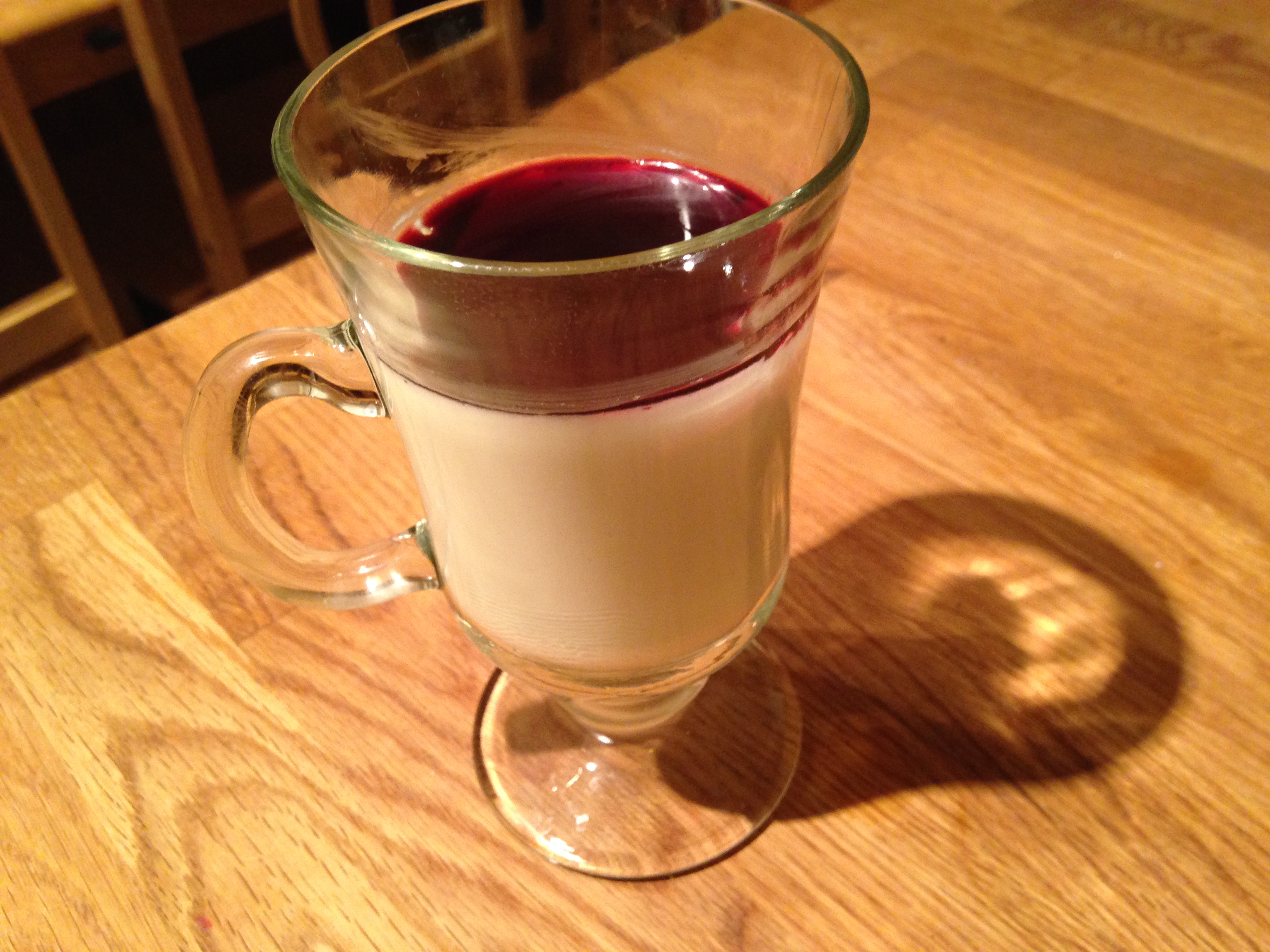 Mama topped this with some leftover pear-poaching syrup. If the panna cotta weren’t properly set, the liquid would never sit on top like that.