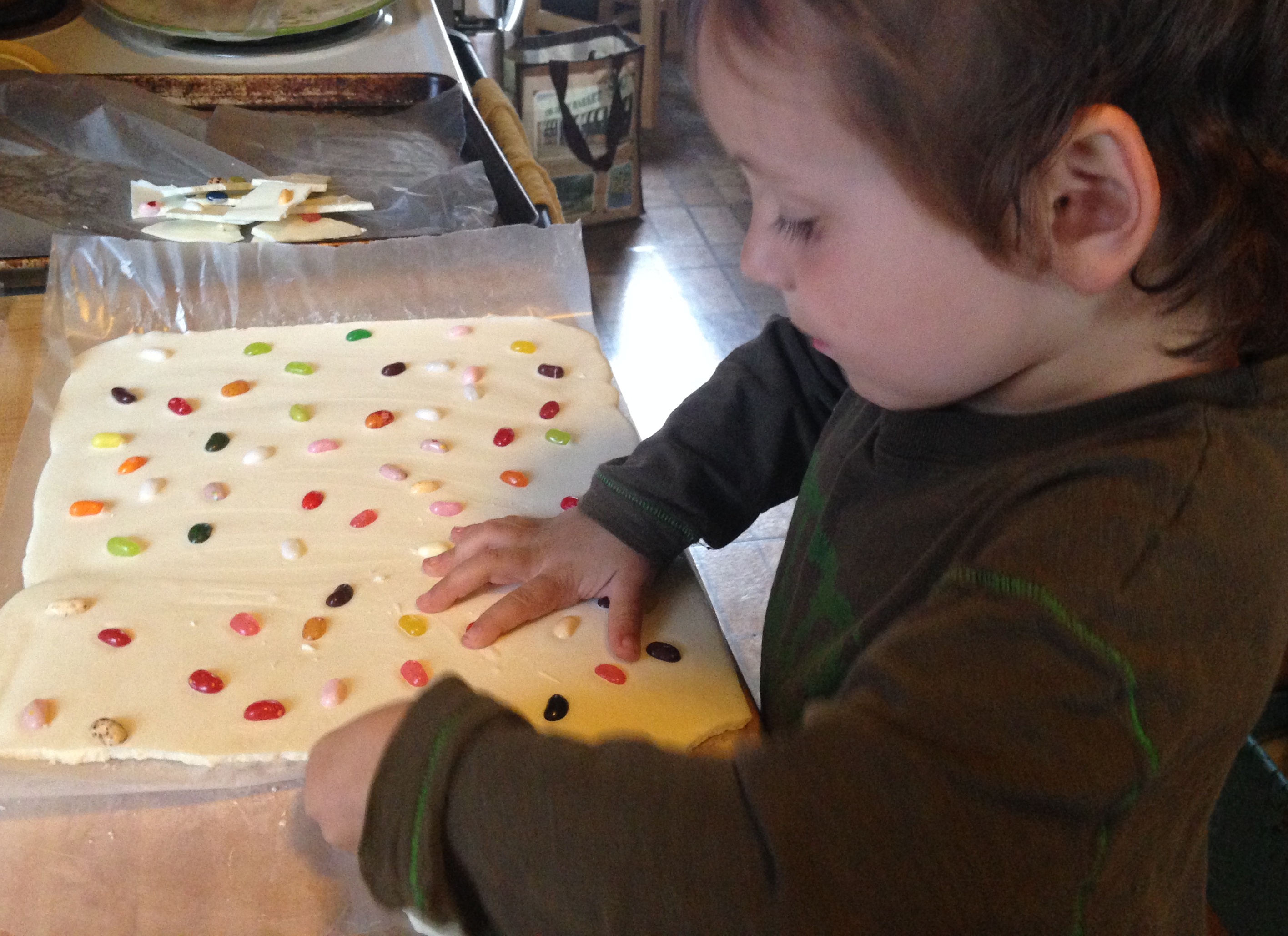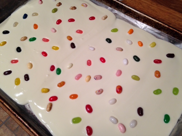 Pour the melted chocolate onto a jelly roll pan or baking sheet lined with waxed paper or parchment paper; our sheet is about 16” x 13”. Spread out the chocolate and then give the baking sheet a little shimmy or a tap to encourage the chocolate to smooth out. Allow to cool a couple minutes, then sprinkle jelly beans on top—in however dense a manner as desired.
