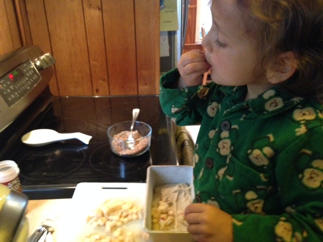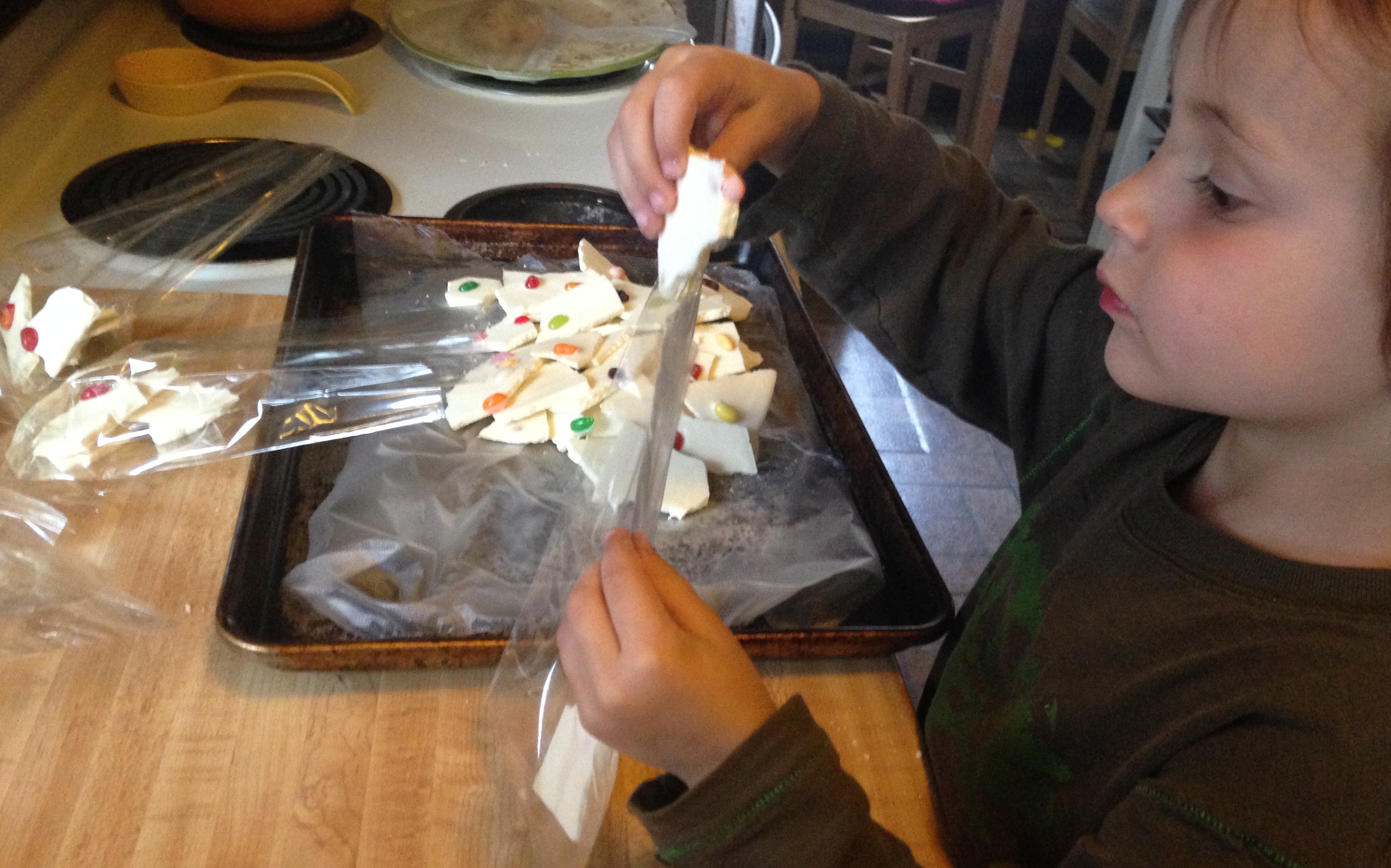 It’s super simple to make. Mama melted white chocolate chips in something she called a double boiler then spread it out in a baking sheet.