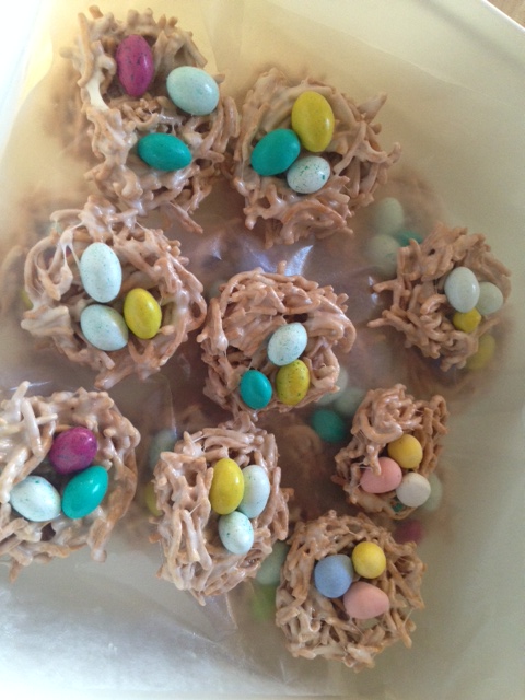 Bonus recipe! We made birds’ nests with other leftover candy. For a tutorial, see how this lovely lady does it. Mama melted a bag of mini marshmallows with ¾ stick of butter, then mixed in 2 bags of chow mein noodles. She rubbed a bit of butter on parchment paper so the nests wouldn’t stick and greased up her hands really well before diving in to the gooey mess. (I did all the measuring; she did all the forming.) Have someone else (like a little kid!) place the candied eggs in the nests while the marshmallow is still sticky, so that they stay put. If you miss your chance, then microwave a small cup of marshmallows for 10–15 seconds until they’re melty, then use that as glue to hold them in place. We made 2 dozen nests, and I still had Easter candy left over. (The Easter bunny was very generous with candy this year, as opposed to years past.)