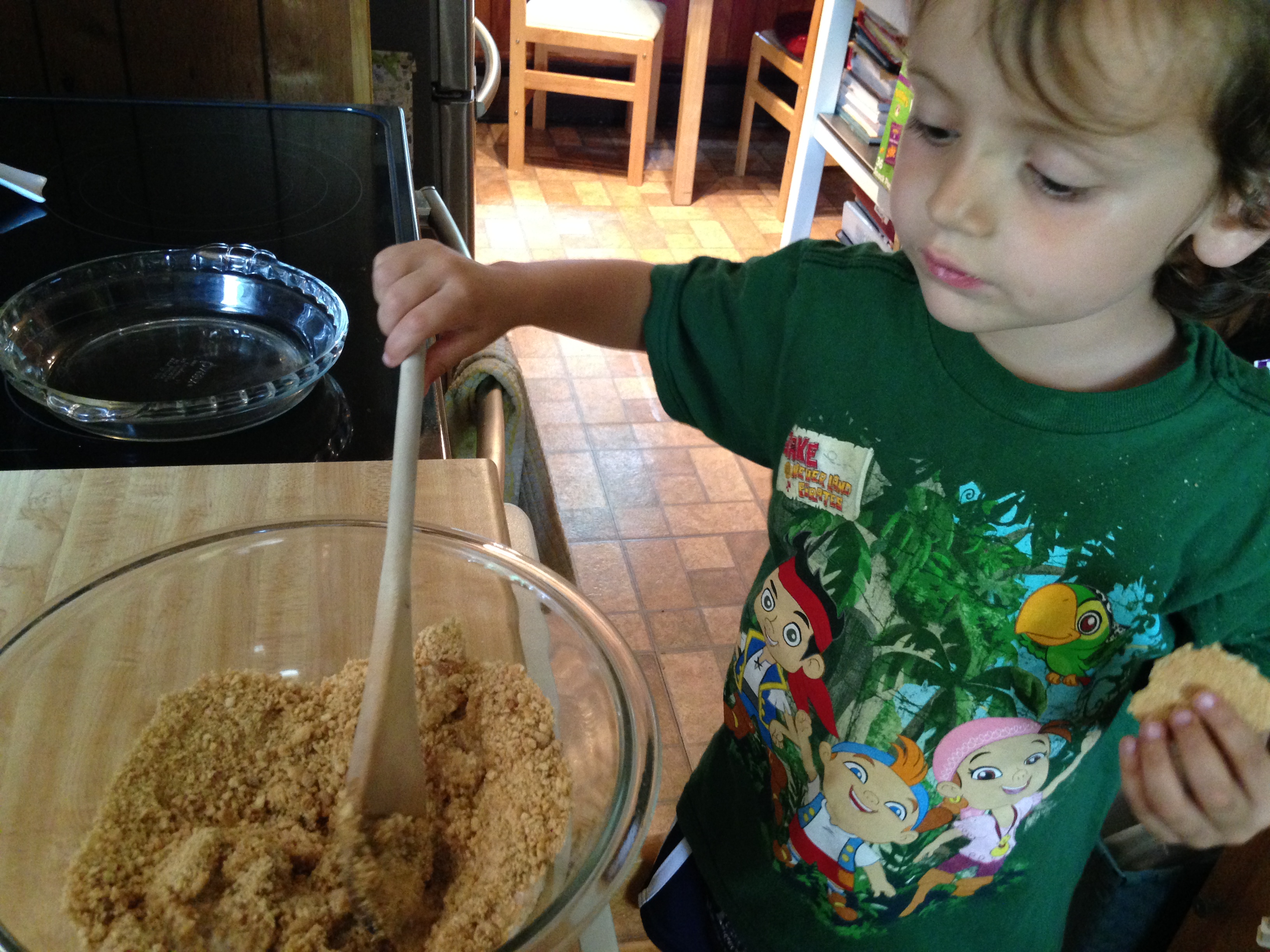 Mama pressed the crumbs into the pie plate. (I didn’t want to touch it.) You should use your hands, but to help press it firmly into the edges and up the sides, use a measuring cup or glass.