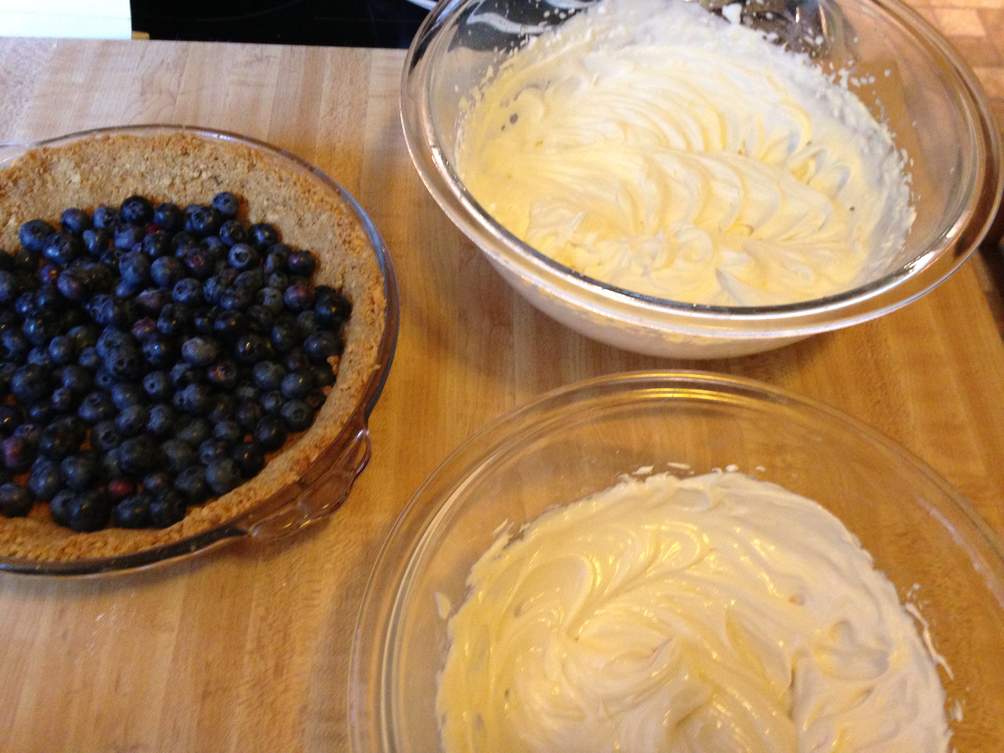 Scatter the blueberries over the bottom of the chilled or baked-and-cooled crust. Carefully spoon the cream mixture over top. Garnish with berries, lemon curls, mint, etc. Keep refrigerated until ready to serve.