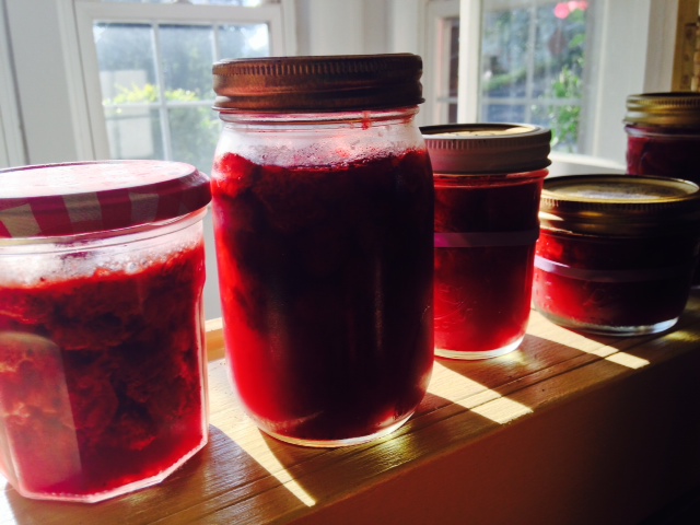 With them, we made a lot of freezer jam. We’ve made it before, but this time Mama tried a new recipe, based loosely on this one. Voilà: