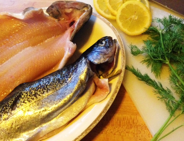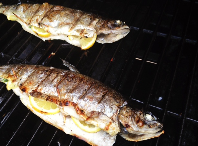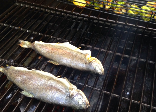 Mama brought home some Idaho-caught rainbow trout from the fish market. Here’s what it looked like: We’ve done whole fish on the grill before. Don’t fear it just because it has a head and eyes. If I can touch the fish, you can, too. Preparation is super simple: Salt and pepper the flesh, add a few slices of organic lemon and whatever herbs you have on hand. We used dill, but tarragon, basil, or chives would have been equally good. Mama stuck a couple toothpicks through the bellies to help keep them closed, then she rubbed a little bit of olive oil on their bodies. Ready to go:
