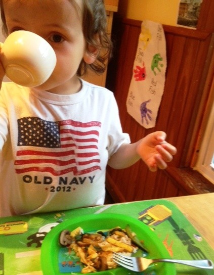As it turned out, I didn’t know I was eating ramps. I ate the rice, the egg, the peas, and the leftover cooked chicken mama tossed in. There wasn’t an overly powerful garlic or onion taste. I took a tiny bite of squash but left the mushrooms. I don’t care how many times Mama says I have eaten mushrooms before; it doesn’t mean I’m going to eat them now. Mushrooms and squash aside, I declared this dinner “delicious”…although, I don’t know why I didn’t get mine in a bowl. (If you’d like to see what else I’ve helped Mama make along these lines, look here and here.)