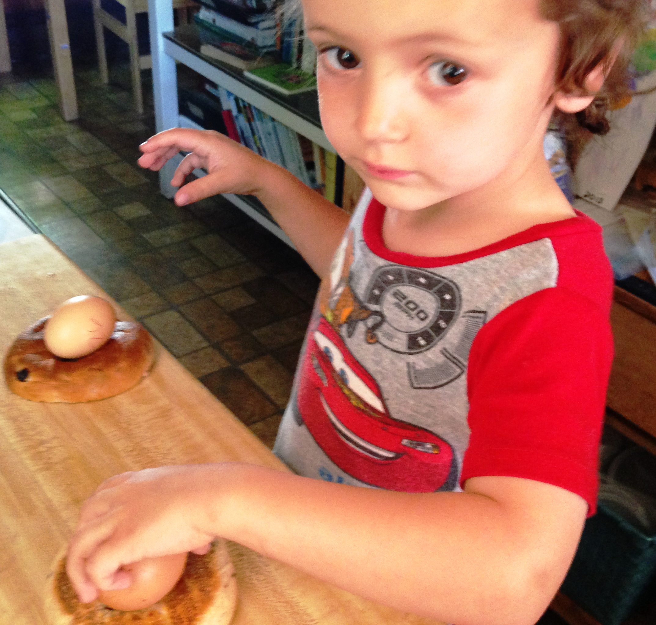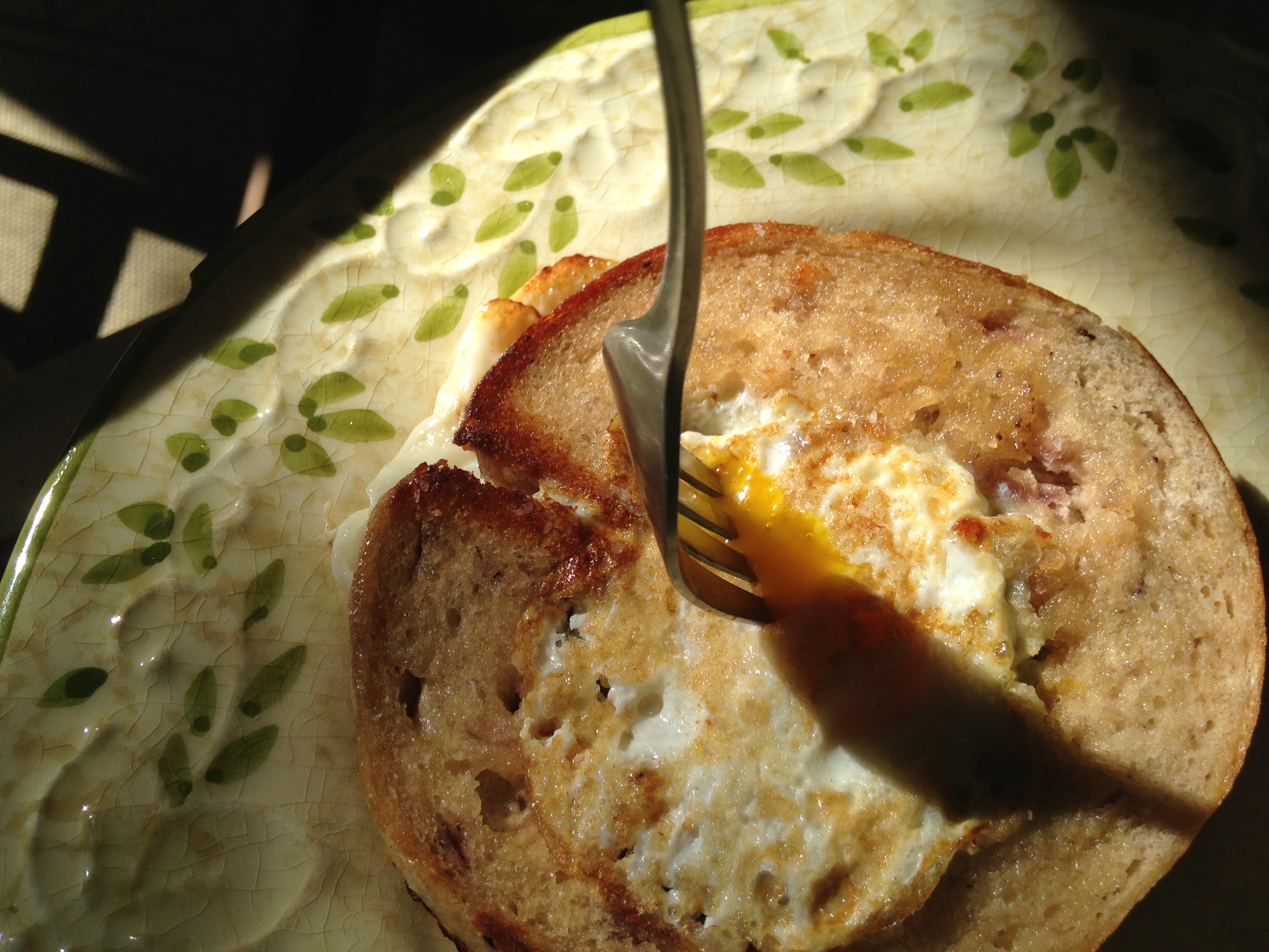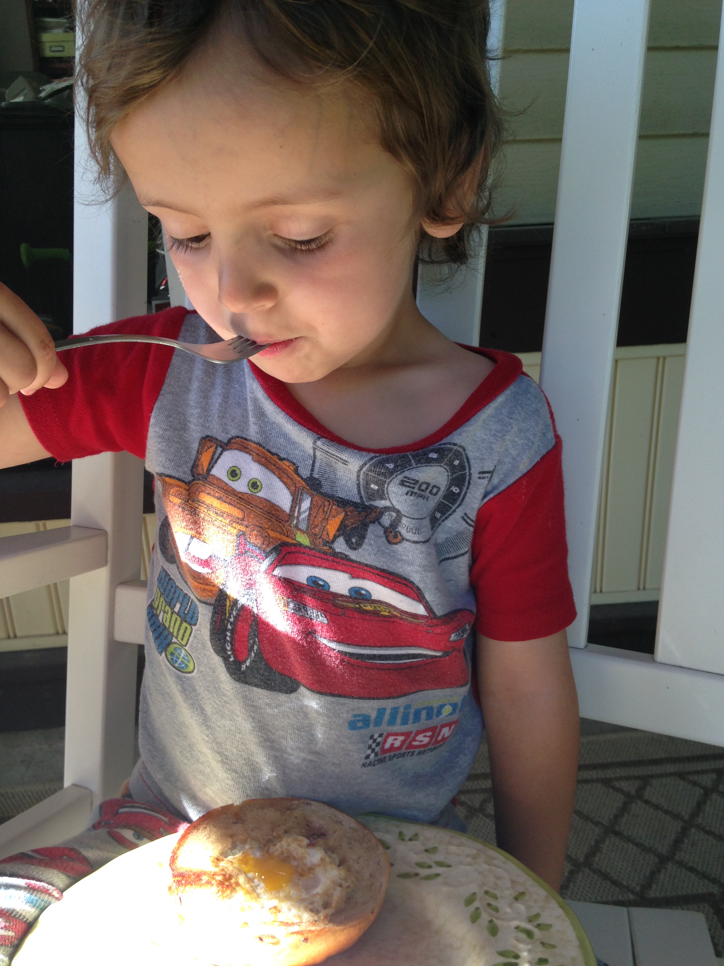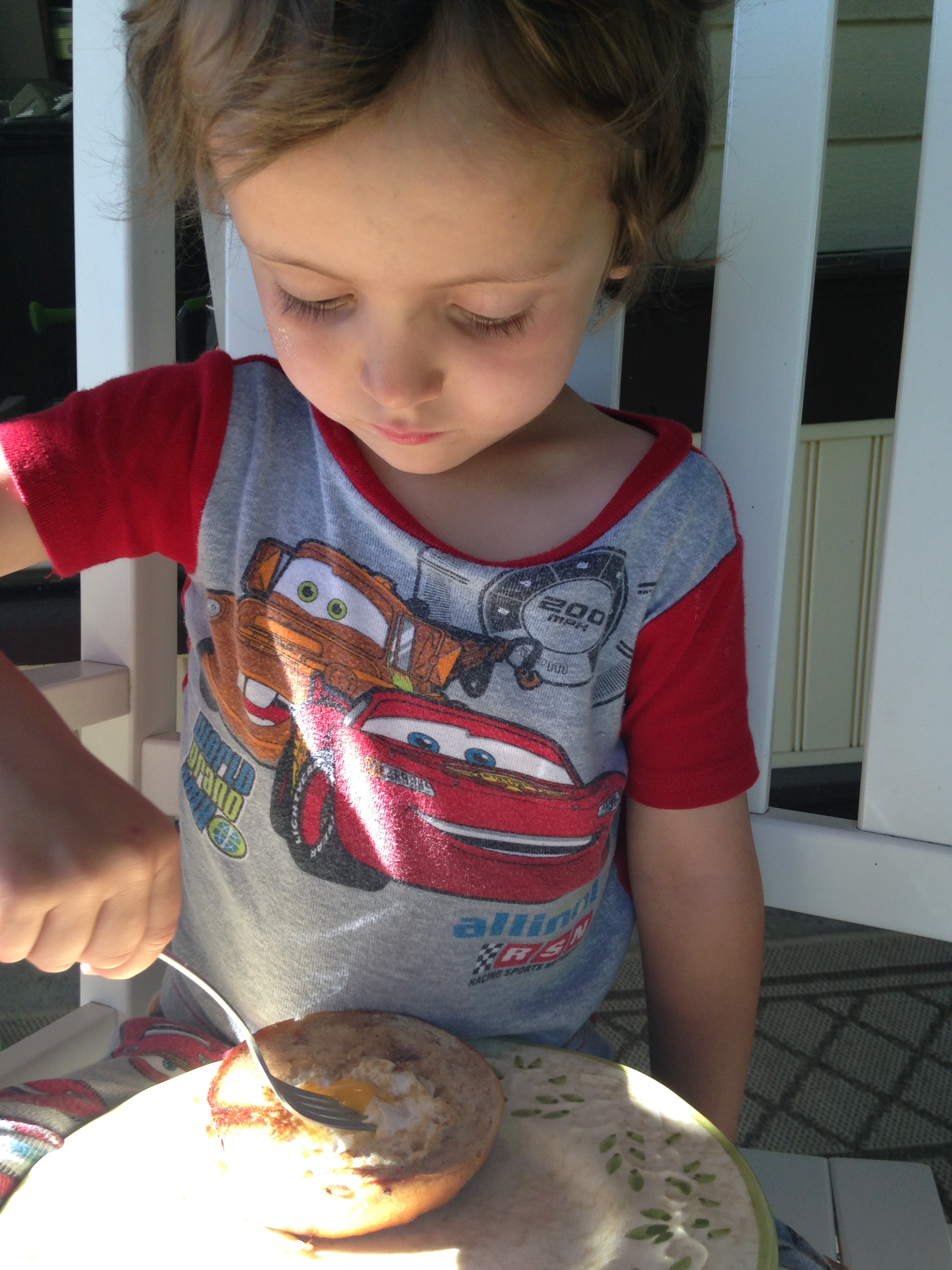 Once I let all the lava flow from the bagel, Papa cut it up for me so that I could smear the bagel through the yolk. The bagel was toasty and buttery, and I love the creaminess of a farm-fresh egg. I wish all meals could be like this.