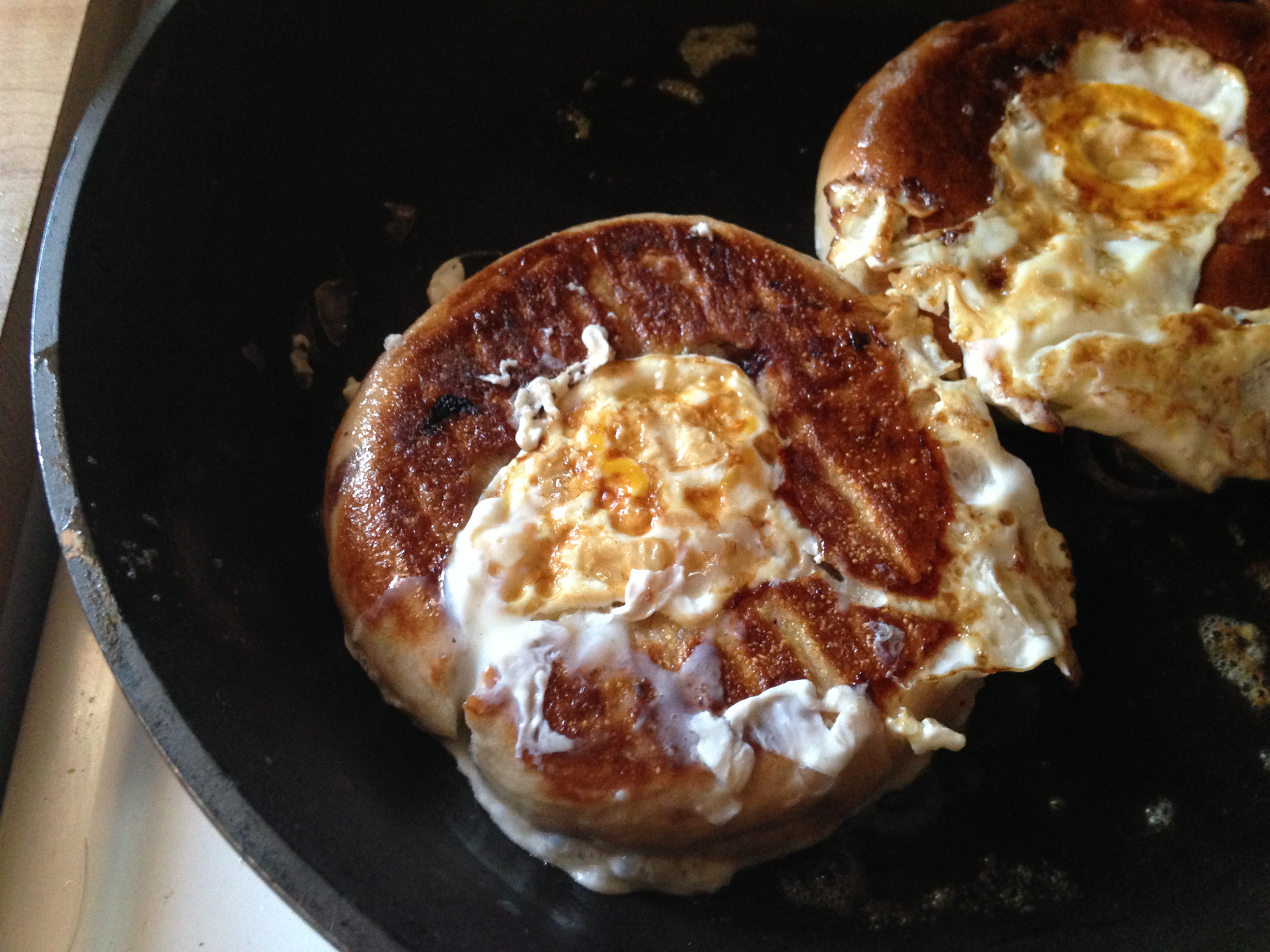 Once he flipped over the bagels, he fried them just until set. (He cooked Mama’s longer because she likes her yolks “stepped on.” Silly Mama. She shouldn’t step on her food!)