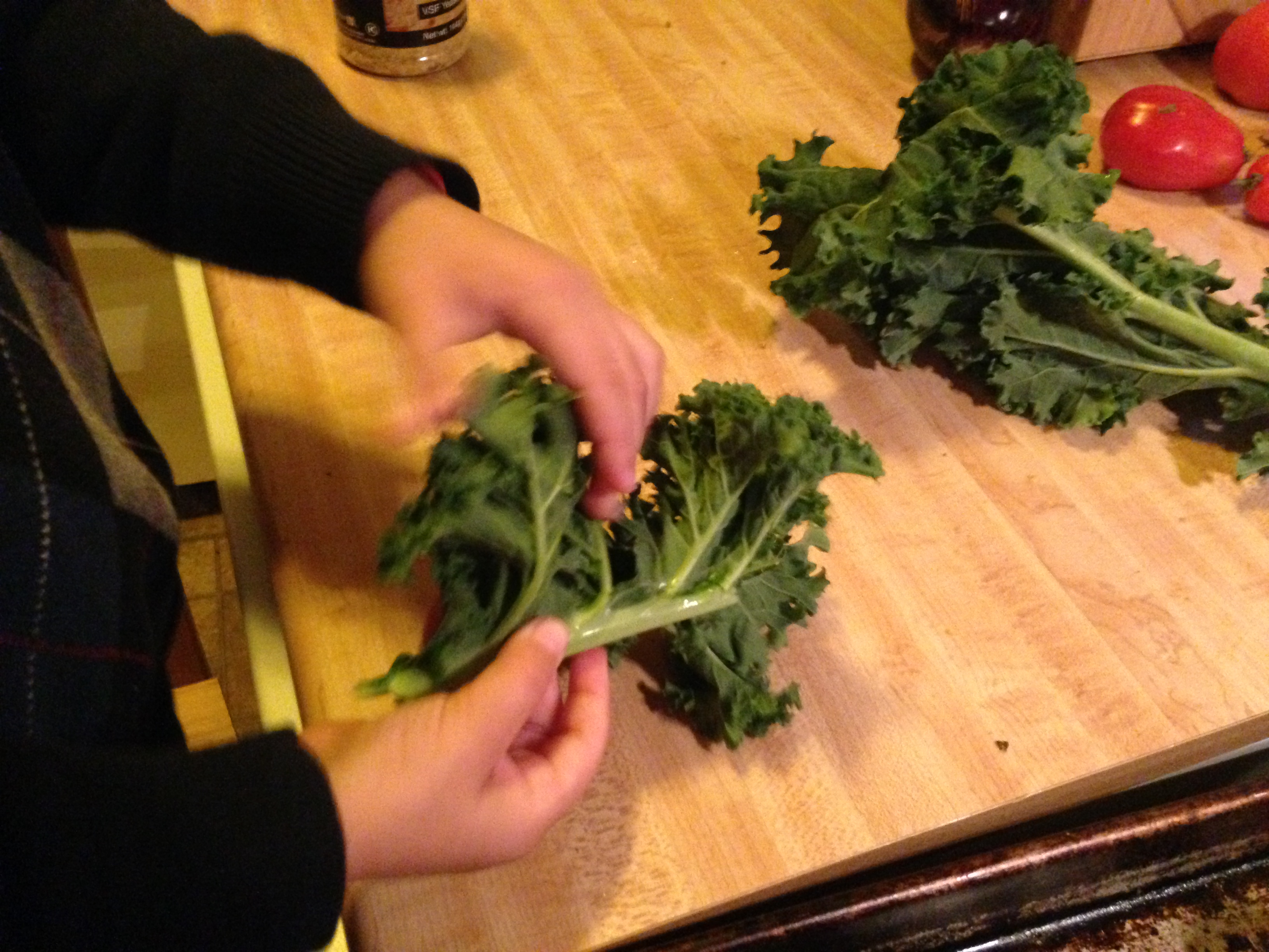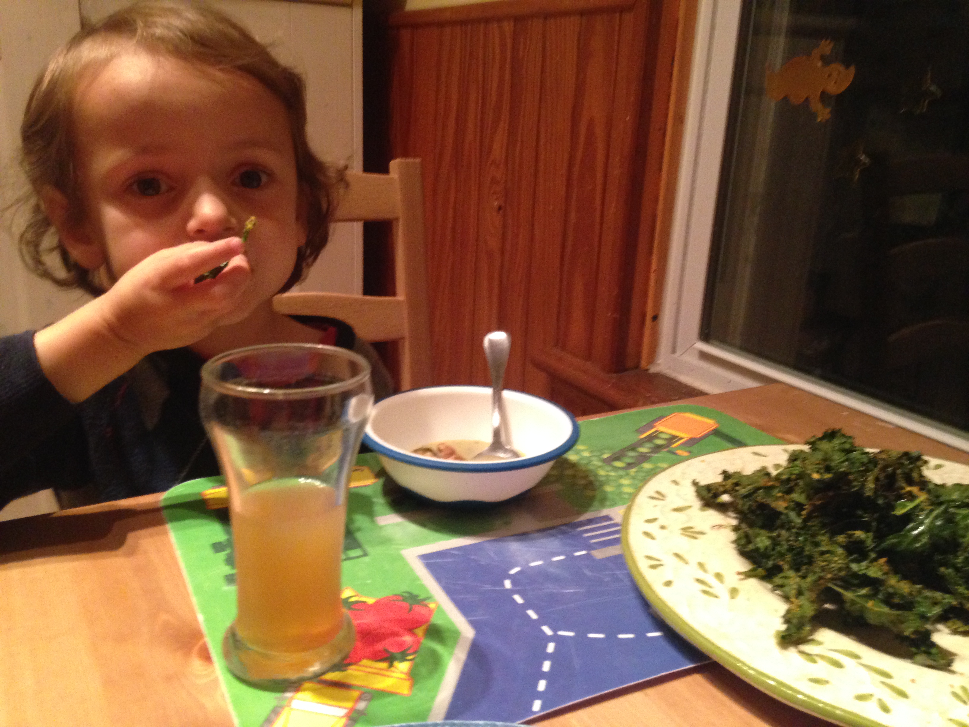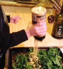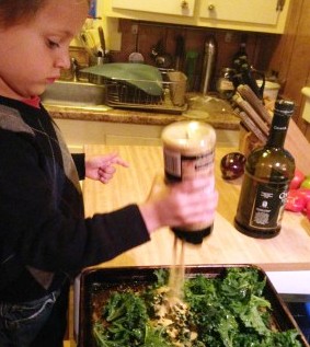 A little more than 2 years ago, I wrote about my love for kale chips. I’m happy to report that—unlike, say, pâté, beets, and orange foods—it’s a love I still embrace. Only now, because I’m such a big boy, I get to help make them. And clever Mama has upped the ante by introducing nutritional yeast into the mix.