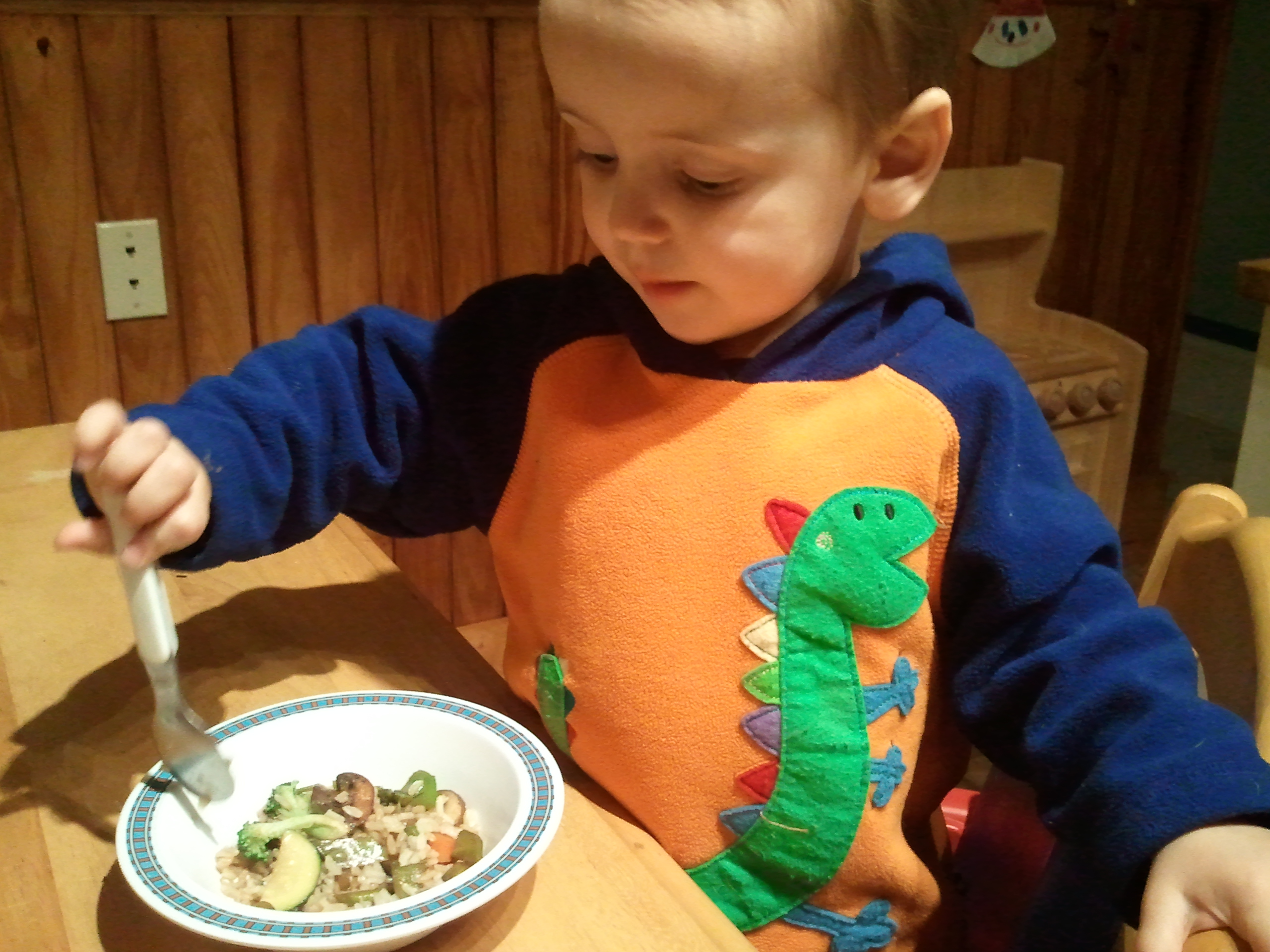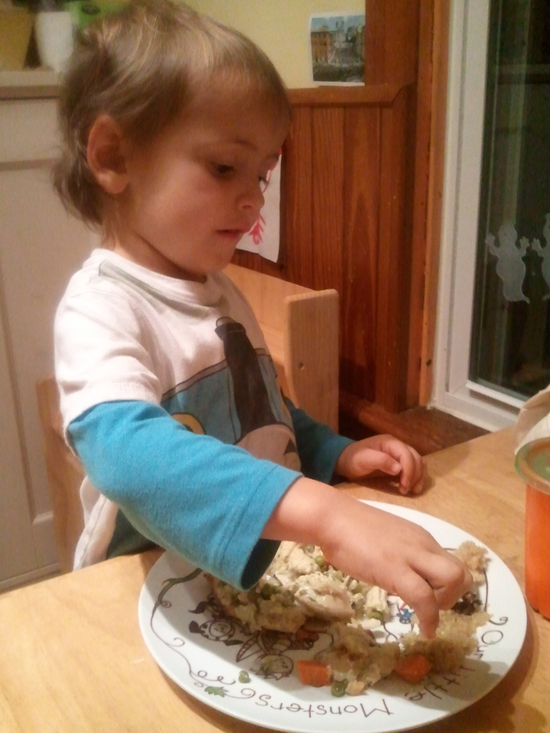 Because it was so warm and sunny outside when Mama picked me up from daycare, she took me to the river so I could throw rocks in it. (I like to pick up the biggest rocks I can carry.) Needless to say, it was already past dinnertime by the time we walked in the door, wet feet and all. Mama chose to make a dinner that practically cooked itself.