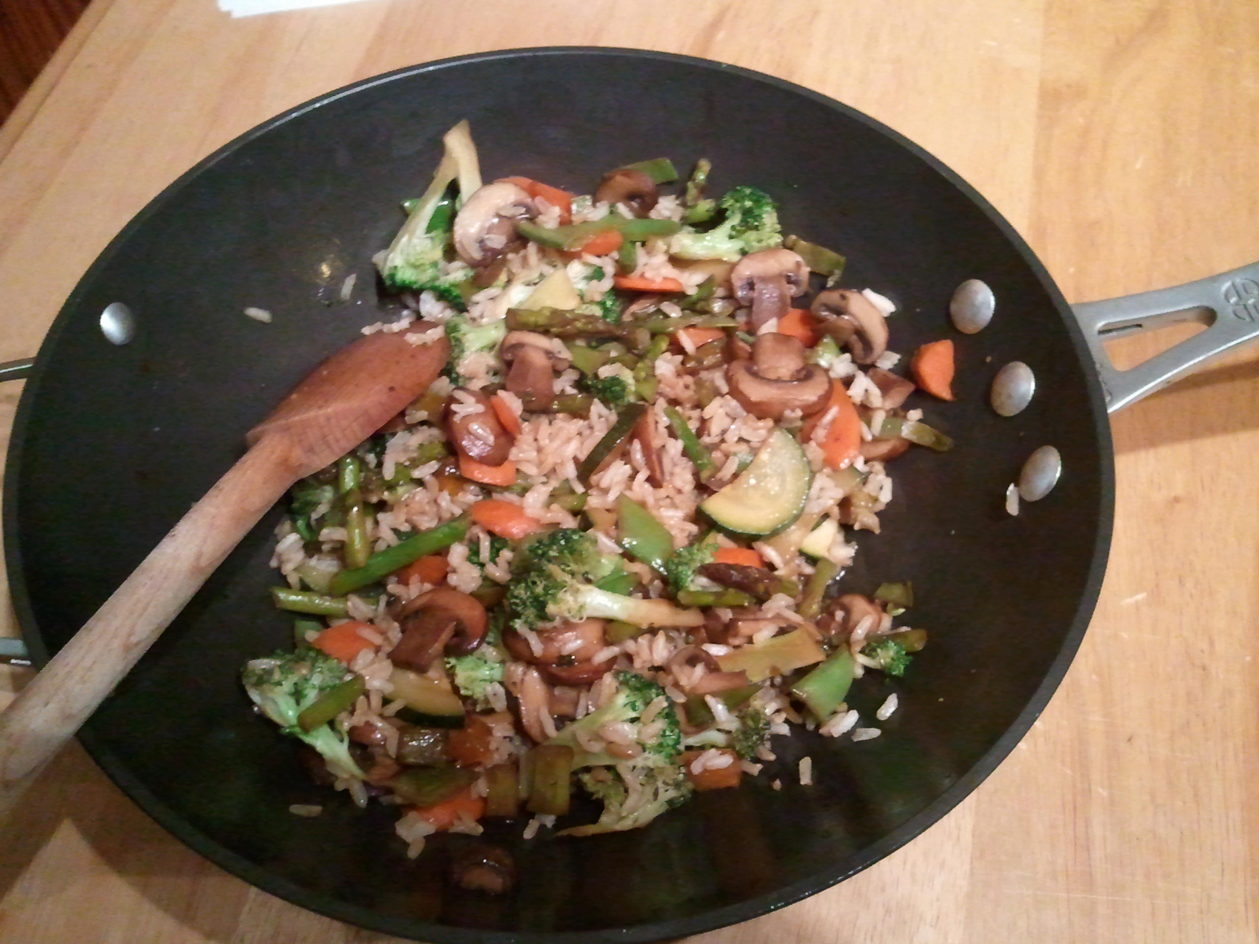 First Mama sautéed the mushrooms to get them golden, then added the remaining vegetables, stirring constantly. Some folks would add scallions or garlic at this point, but Mama opted not to. Then she added about equal amounts of seasoned rice vinegar and tamari, which is similar to soy sauce. And that’s it! Serve with brown rice, top with cilantro or lime or chopped peanuts/cashews (if desired), and you have dinner.