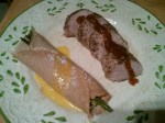 I dutifully dipped my juicy pork in the sweet fig sauce. I ate my skinny spears of asparagus, after sprinkling some Parmesan on them. And I munched my soft crêpe. (I like regular pancakes better, though.) All in all, a pretty tasty meal. And I’m pretty sure Mama’s eyeing the leftover crêpes for breakfast with bananas and a smear of Nutella. It’s just a guess.