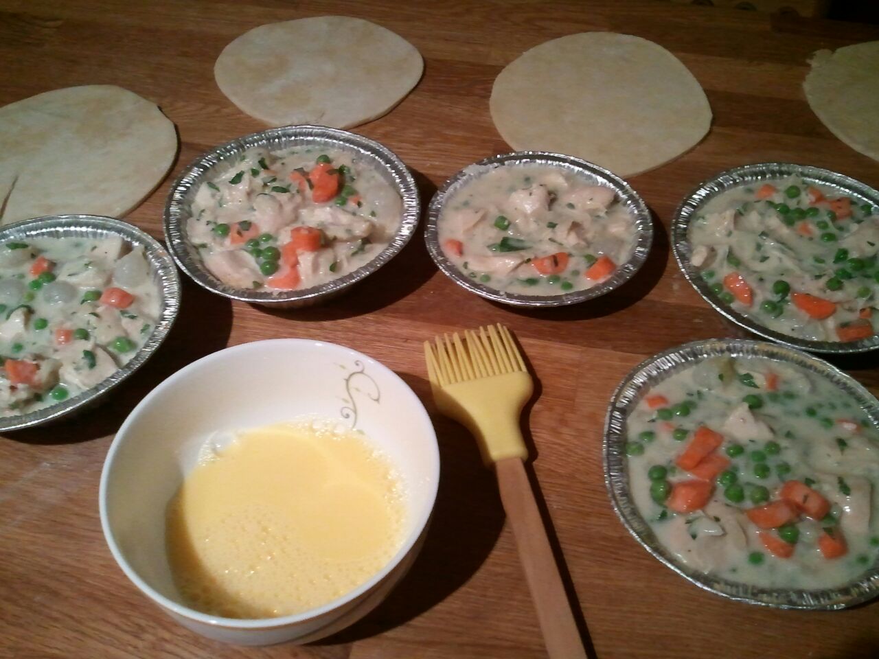This is the chicken filling. Fill one pie to see how much you want it filled, then stick with that amount for each pie. While the dough rests before its second re-roll, go ahead and egg-wash the rims of the pie plates and finish the pies.