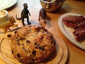 Mama and I made Irish soda bread today to go along with the corned beef she was braising. I sifted the flour and cut in the butter and mixed in the buttermilk. (I didn’t knead it, though.) We served it with honey butter.