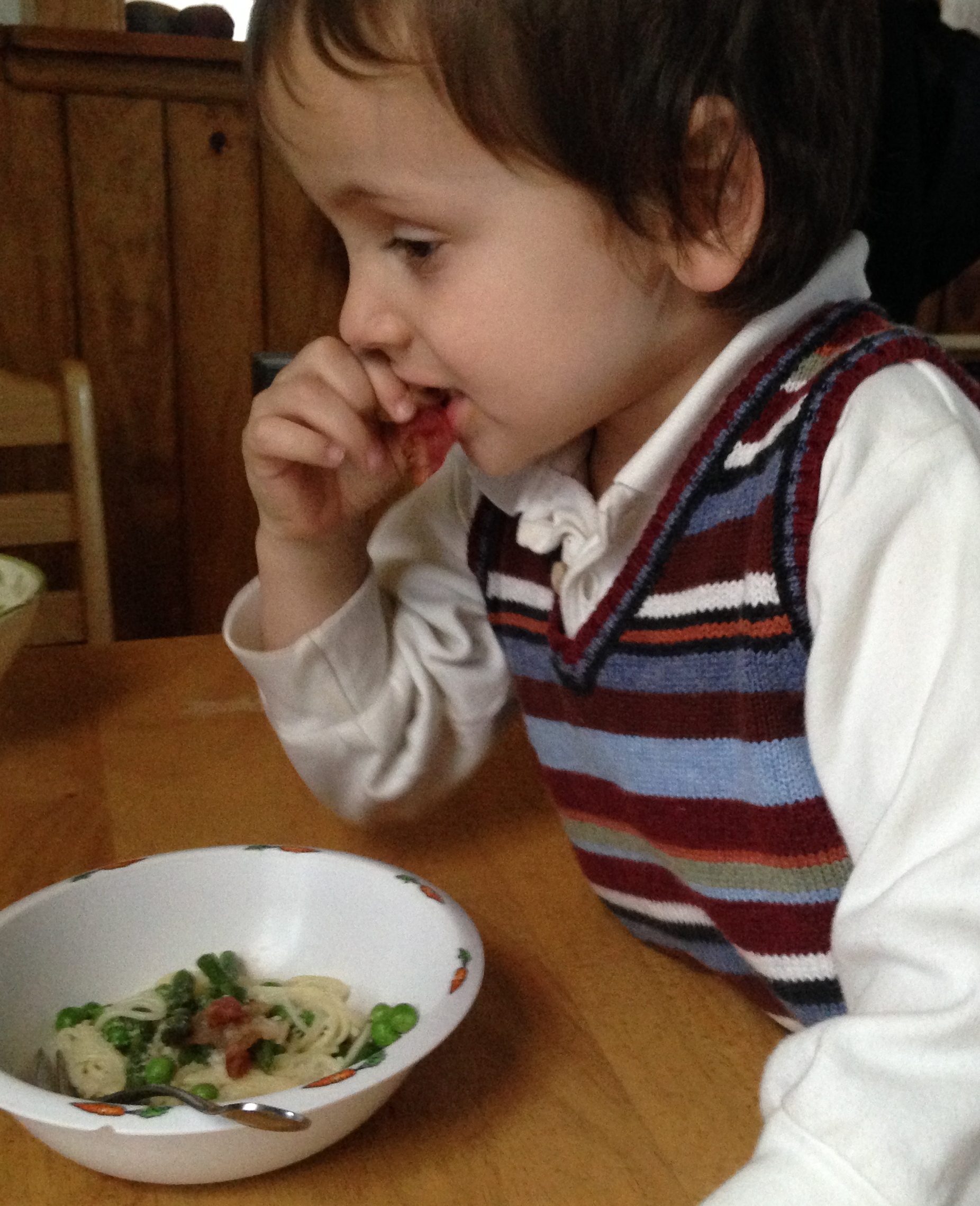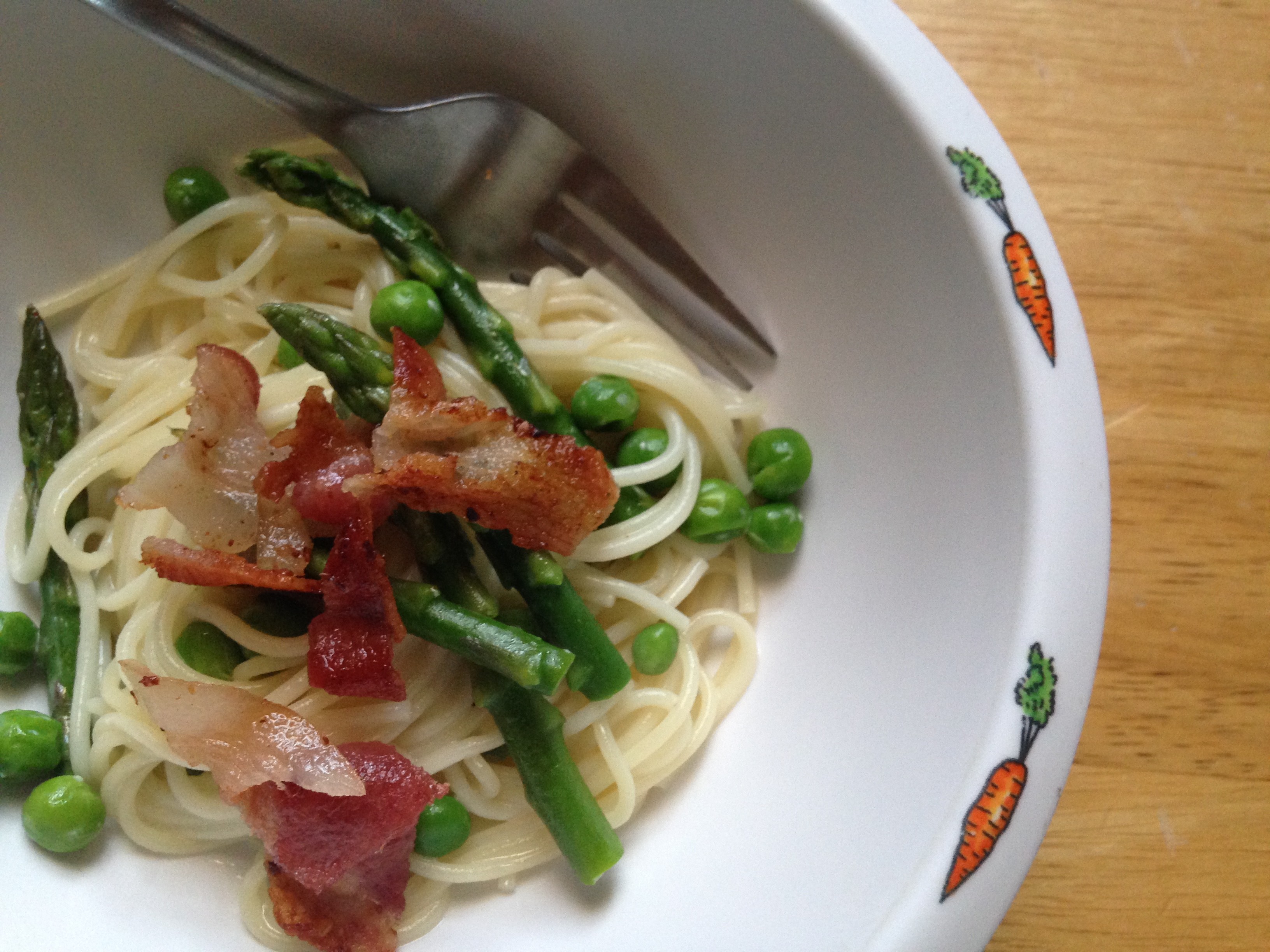 Because it feels like spring outside, she figured asparagus and peas were the way to go. She boiled water for pasta, and when it was nearly done, she added the veggies. Meanwhile, in another pan, she cooked bacon, and then made a sauce out of the drippings, veggie stock, and cream cheese. Hear me out: It was creamy with just the right bit of salty, and the veggies were brightly cooked and fun to eat! But as in all things Jude, however, I had to be convinced to try it.