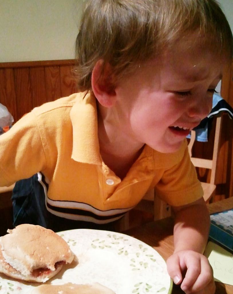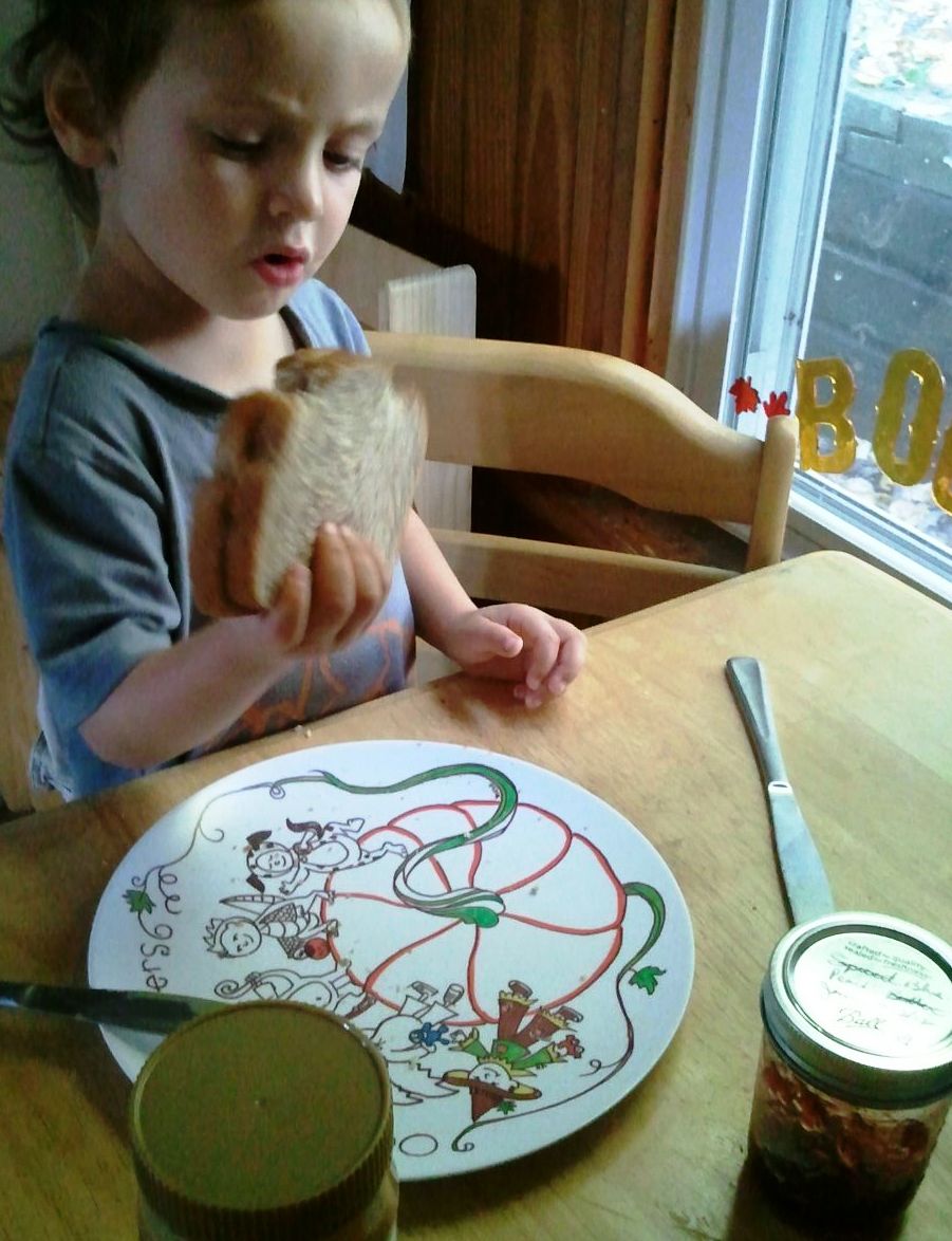 Mama spreads either jam or peanut butter first on one half of the sandwich then wipes the butter knife on the clean half. No, no, no! She doesn’t realize that she’s just contaminated that half of the bread, and this is clearly unacceptable. Witness: