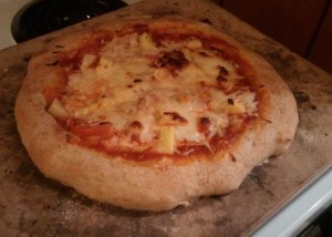 Then she started flinging the dough between her hands! Back and forth, back and forth, back and forth. The dough started stretching and sagging, and before I could say “Chicago style,” she flopped it onto the stone with a thwack. She patted it a few times to make a ridge around the edge, then she brushed the edge with olive oil and sprinkled it with garlic powder. She spooned lots of sauce around the middle, put our favorite toppings on it, then smothered it with mozzarella and parmesan. I couldn’t even see the pineapple there was so much cheese.