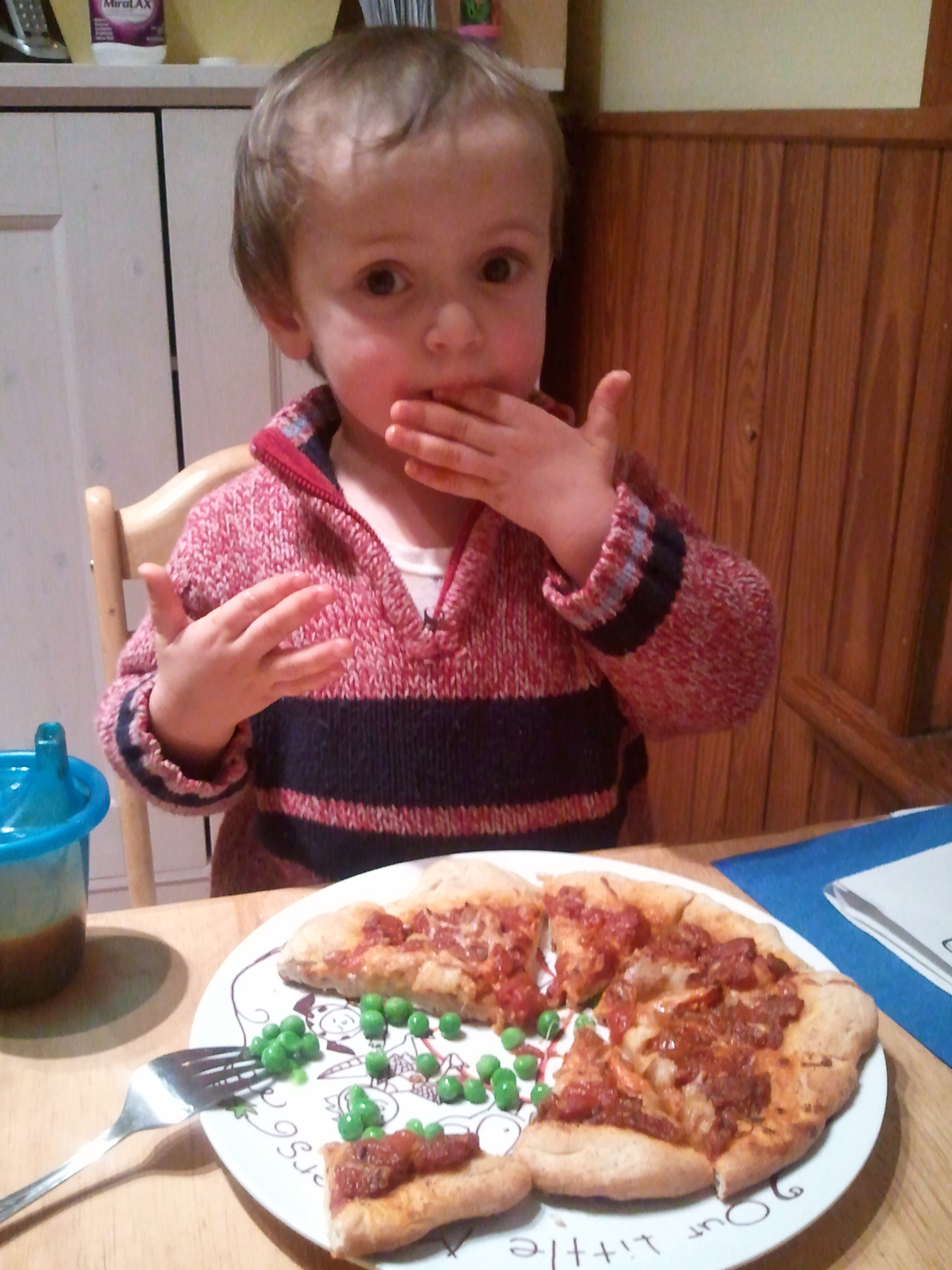 So shame on her for keeping it from me for as long as she did! While some people choose to believe pizza’s actually sort of good for you (wheat in the crust, tomatoes in the sauce, dairy in the cheese, and all those other veggies you choose to put on top), Mama’s more on the fence about it. At least as far as it concerns me, pizza is a junk food. But as I grew up, I began to notice this interesting food she and Papa were putting into their mouths. It smells delicious, it’s shaped like a triangle (that’s a shape I know!), and it’s covered in cheese. Little by little, Mama relented. She started by giving me the tiniest pieces cut from a slice…