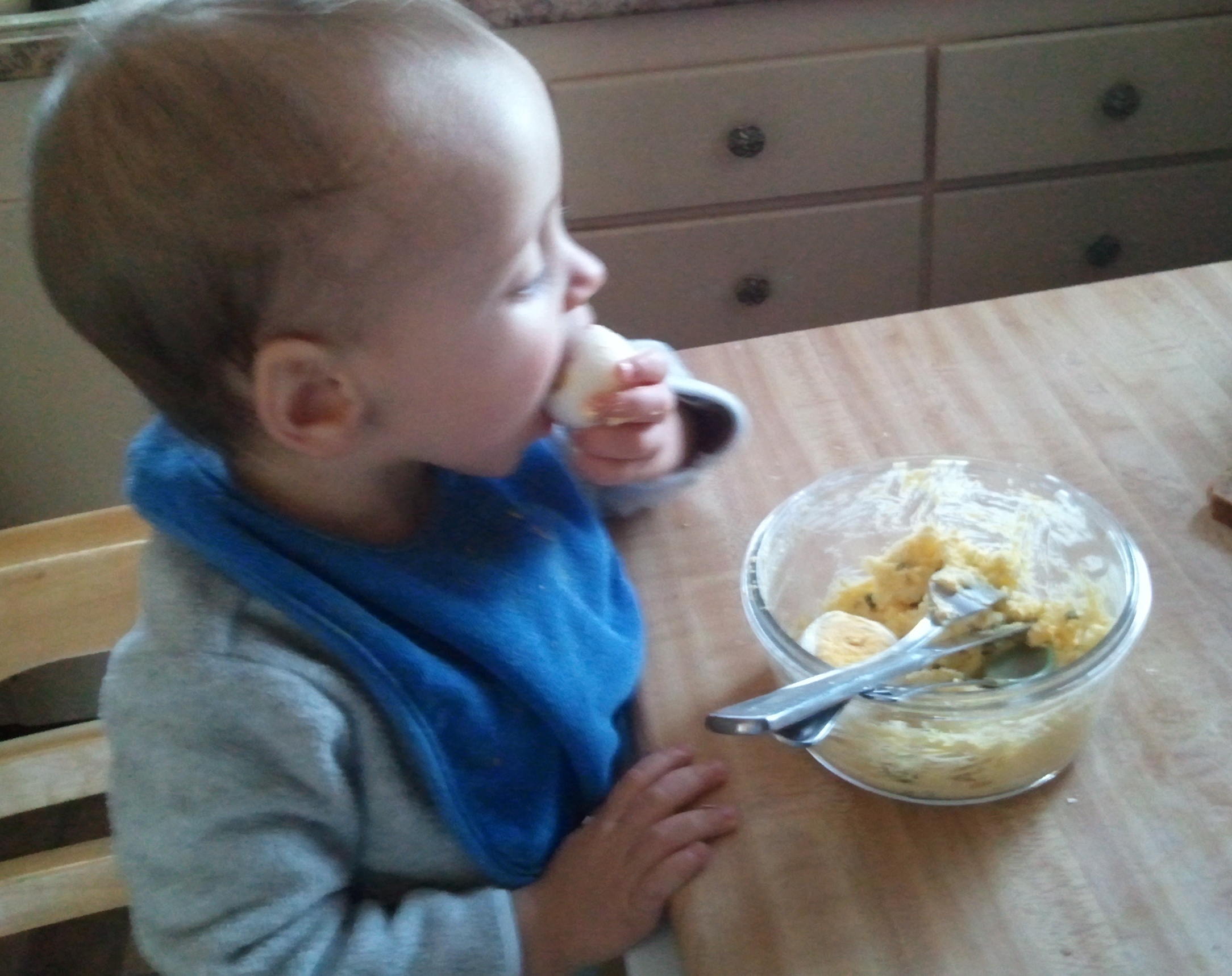 Mama says if you want to make this the night before, you can pull together the wet ingredients in one bowl and the dry in another, but don’t mix them, or the oats will absorb all the liquid before it has a chance to bake in the morning. Sorry, not much of a shortcut here, but just think of how yummy the house smelled as it baked while Mama was wrangling yours truly. And I can eat it for breakfast tomorrow, and the next day, and the next…