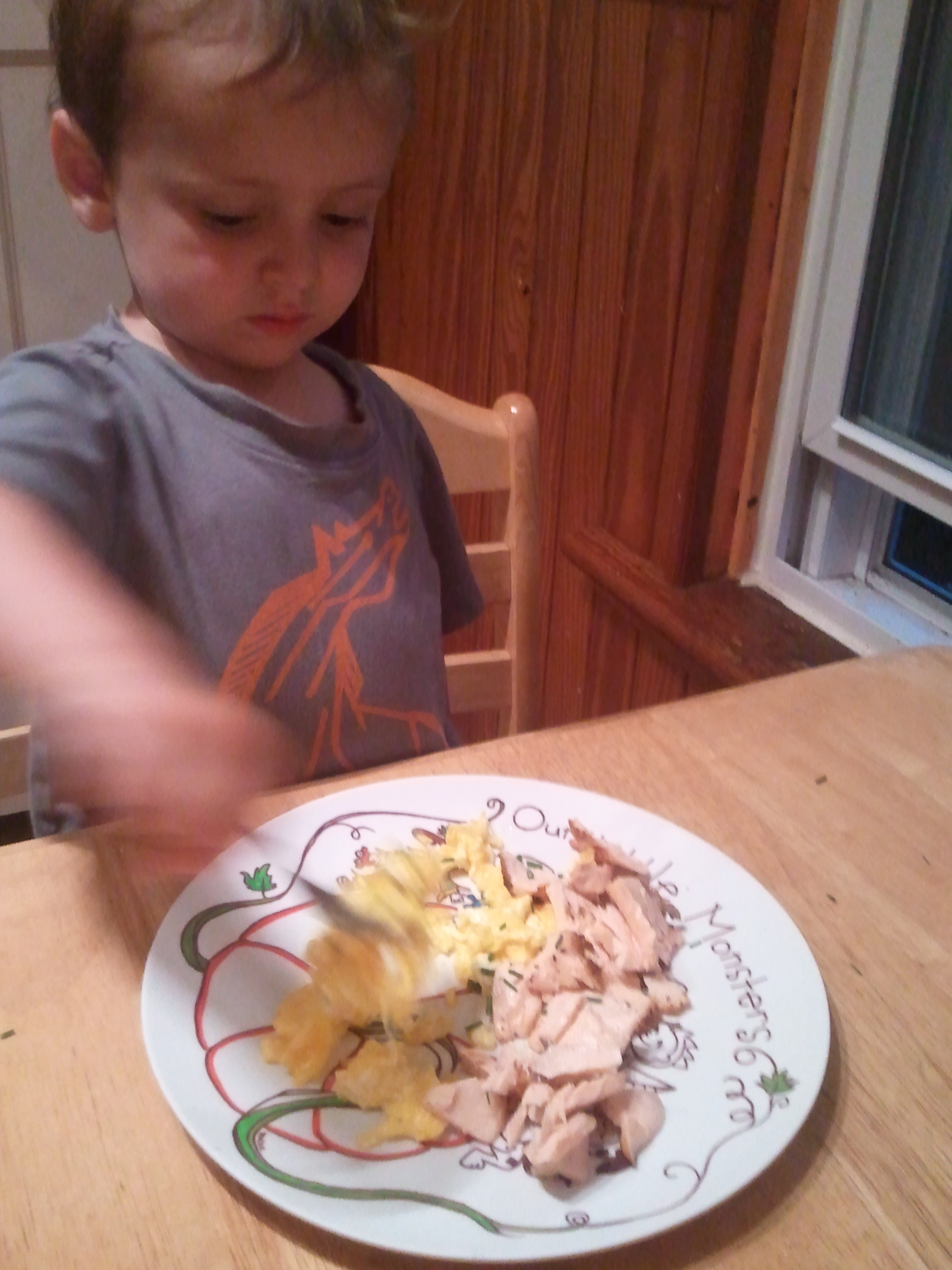 So, even though I ate a whole bunch, we had some leftover salmon. (No, not that Leftover Salmon.) Tonight, Mama pulled together an even faster dinner: She soft scrambled some eggs from my friend Walter’s farm, flaked and heated the salmon, then sprinkled on some chives from our garden. She considered making a salmon omelette, but when you have a 2-year-old saying, “I want dinner now,” over and over (and over), I think you’d opt for scrambled, too. And boy, was it good. You know how much I like eggs, so that’s saying something. Mama said this would have made for a fine breakfast over toast, but I was just as happy to eat it for dinner.