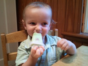 What I like about these popsicles is that I can bite them. They’re just a little bit crystally and not too hard. They’re sweet, but they mostly taste like the green melon. And I see that Mama snuck a little raspberry into each one that I have to munch may way down to. I also like that I can hold it by myself, which just means that I can offer it up to Mama (or Papa) for a taste. Just a taste, Mama.
