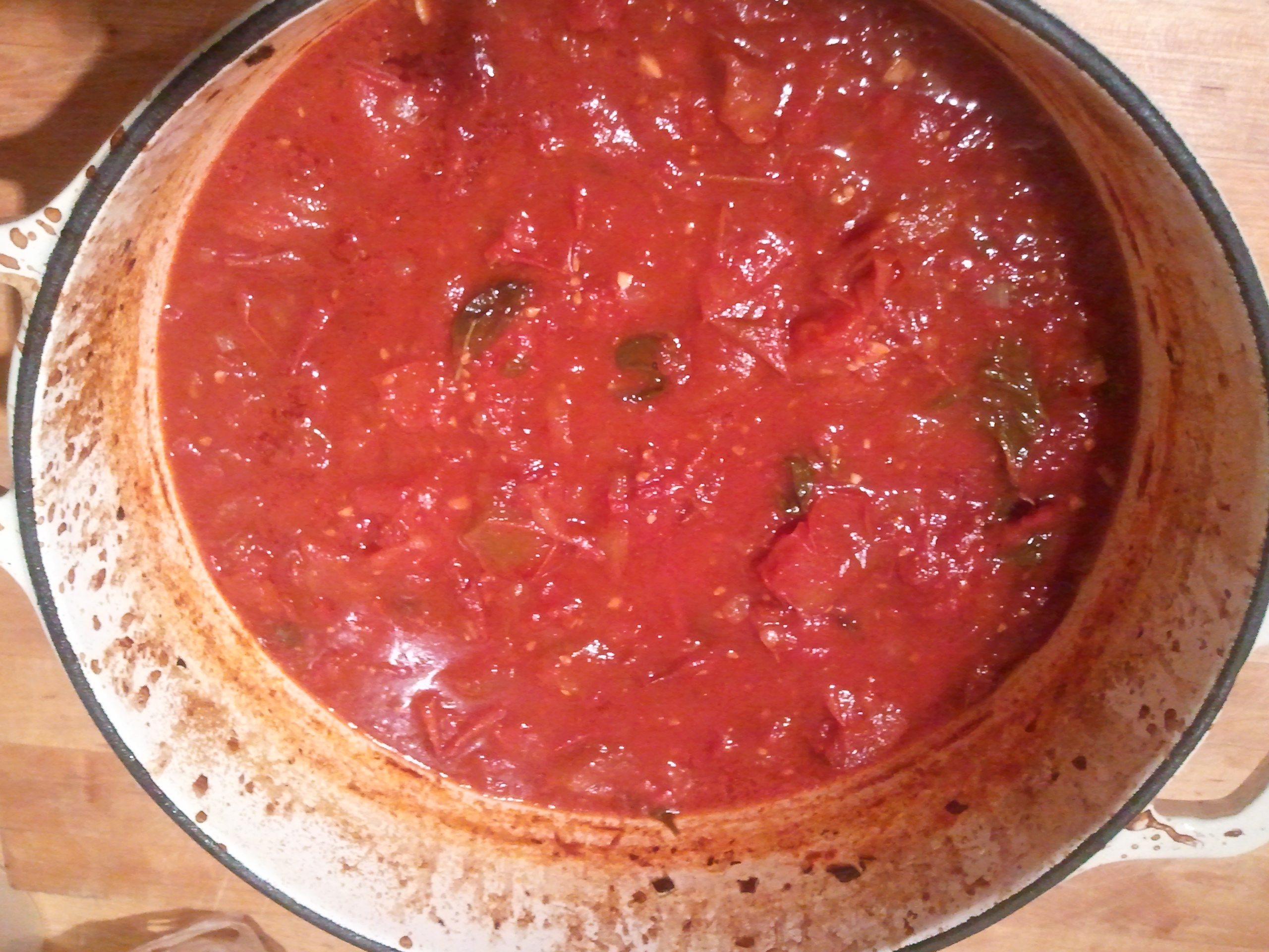 Once the tomatoes cook down, they’re going to release all their delicious juices. To add a bit of body (and to give the sauce a fighting chance of sticking to pasta), Mama did add a small can of organic tomato paste. When everything was good and bubbly, she put the whole pot, lid and all, in the oven on a lowish heat, about 300°F, and forgot about it. Well, not really. Every now and then she left me to play on the porch while she stirred the sauce, and the heavenly sweet smell would waft through the windows to where I sat. She cooked it until it reduced to a thickness she liked and the flavor was concentrated enough to be considered “awesome.”