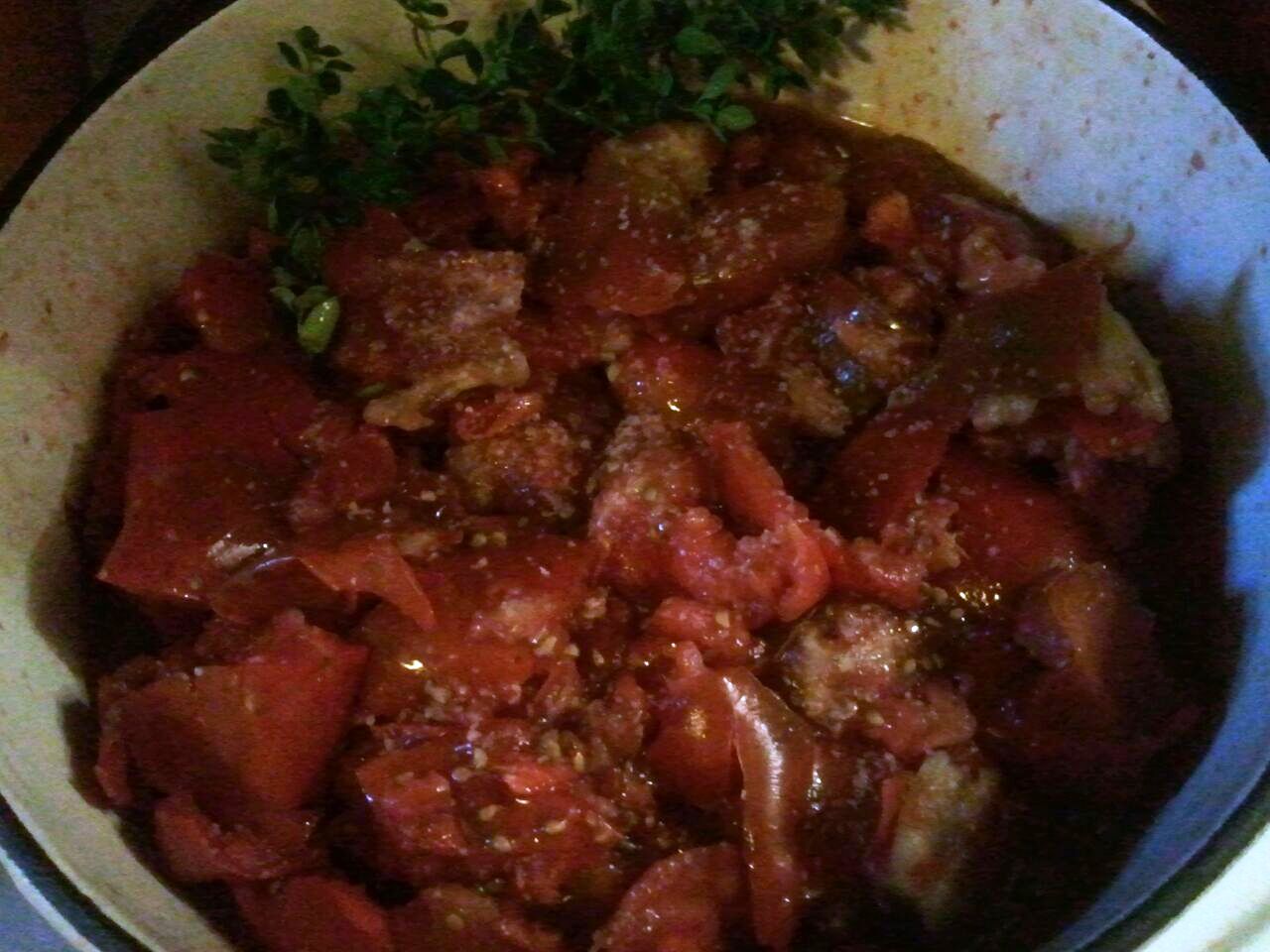 Coat the bottom of a large, oven-safe pot or Dutch with olive oil and heat it over medium heat. Add the onion and sauté, stirring occasionally, until very soft and beginning to caramelize, about 10 minutes. Add the garlic and sauté 1 minute more. If desired, deglaze the pot with a healthy splash of red wine. Carefully add the tomatoes in batches, squishing them with your hands as you go. Mama supposes you could skip the squishing step, but it gets the juices released a bit quicker. Alternatively, you could give them a few pulses in a food processor to speed things up. But we’re not talking fast here, are we?